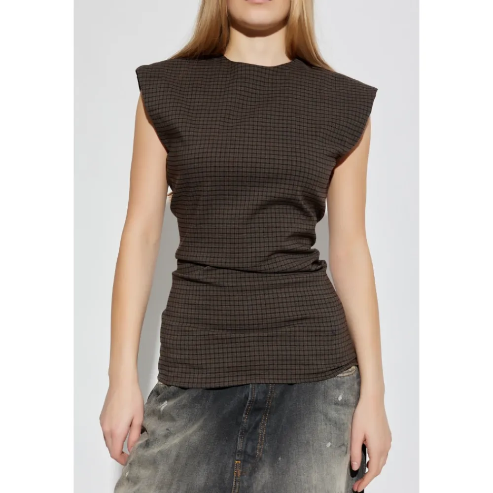 Acne Studios Wool Top opdaterer skandinavisk minimalisme med en skulpturel, ærmeløs silhuet. Det figursyede snit, den diskrete rynkning i taljen og den ternede uldstrik skaber et raffineret, formbestandigt look. Vigtige egenskaber: Brun | Uld | Formbestandig strik | Komfortabel at have på | Rund halsudskæring | Ærmeløs konstruktion | Brede, dybt udskårne skuldre | Figursyet silhuet med diskret rynkning | Terneret strikstruktur | Mål og pasform: Figursyet snit | Diskret rynket i taljen | Brede, dybt udskårne skuldre