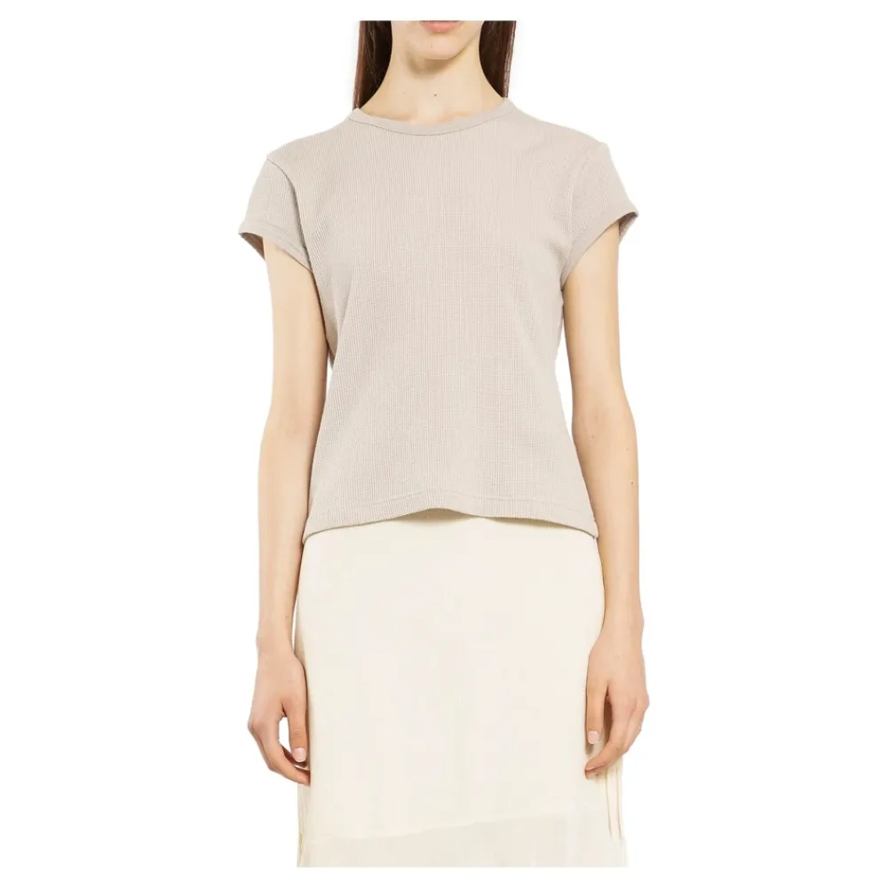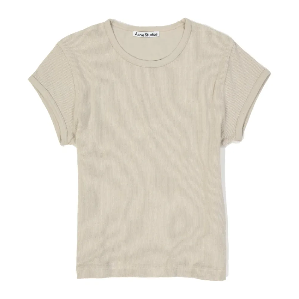 Forkæl din afslappede garderobe med denne ACNE STUDIOS T-shirt til kvinder. Lavet af 100% bomuld, den har en rund hals, korte ærmer og en chic beige farve, perfekt til hverdagsbrug eller lag-på-lag look.