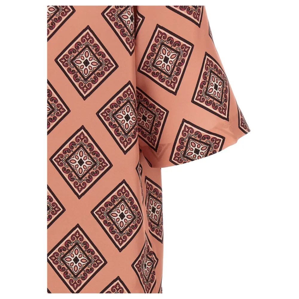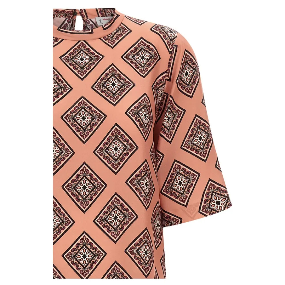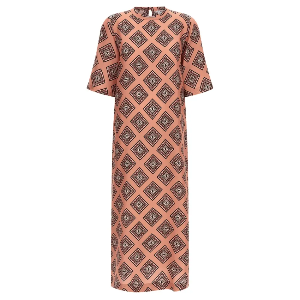 Alberto Biani Lang Kjole er en silke maxi, der er designet til komfortabel og elegant brug. Den fremhæver en rund hals med en dråbeformet udskæring bagpå og en knaplukning bagpå for en raffineret finish. Vigtige egenskaber: Pink | Silke | Knaplukning bagpå | Rund hals med dråbeformet udskæring bagpå | Brede, korte ærmer med dropped shoulders | Slips print | Slids bagpå | Dimensioner & pasform: Komfortabel pasform | Maxi længde