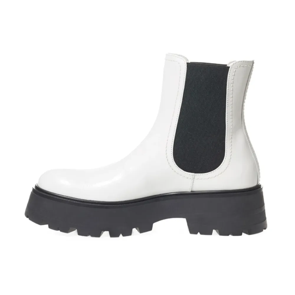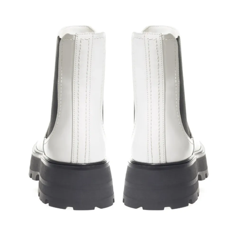Forkæl dig selv med disse Alexander McQueen Chelsea-støvler i børstet læder, hvid farve, tonale syninger, oversized flæset sål, lagdelt sort hæl, kontrastelastikbånd på siderne. Sammensætning: 100% Læder.
