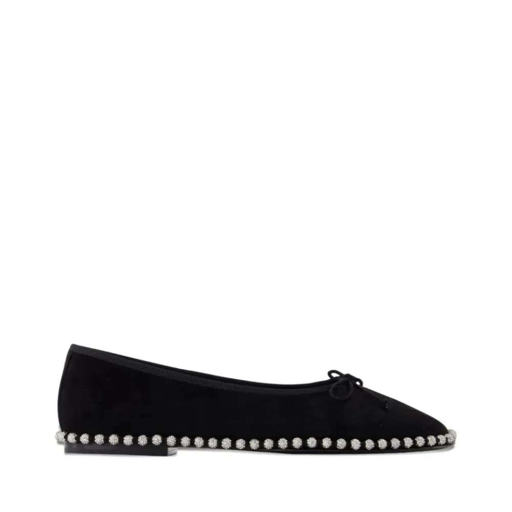 Alexander Wang Ballerinaer med pynt og spids tå præsenterer en raffineret ruskindssilhuet med en spids tå og krystalbesat sål, designet til ubesværet at gå fra hverdagsbrug til aftenbegivenheder. Nøgleattributter: Sort | Ruskind | Spids tå | Delikat bindebånd ved vristen | Krystalpynt langs sålen | Ballerina-silhuet | Sammensætning & pleje: Ruskind