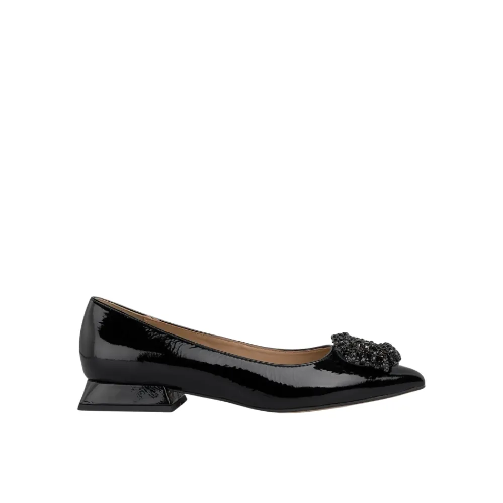 Dameflad sko med en cirkulær strassudsmykning på tåen. Ingen lukning og spids tå. Hælhøjden er 2 cm.