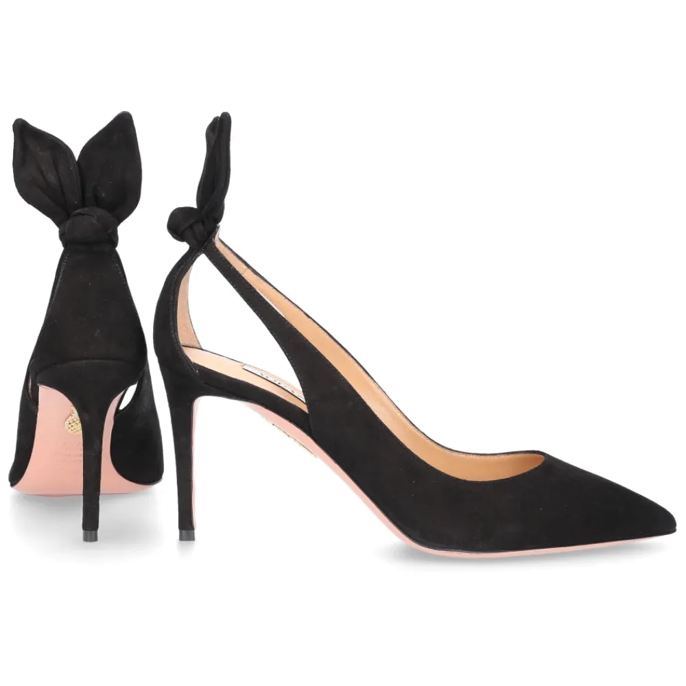 Forhøj din stil med disse sorte Aquazzura ‘Bow Tie 85’ pumps. Med en stiletto hæl, spids tå, sløjfe detalje bagpå og cut-outs på siderne er disse ruskindspumps både elegante og stilfulde. Den polstrede indersål sikrer komfort. Hælhøjde: 85 mm.