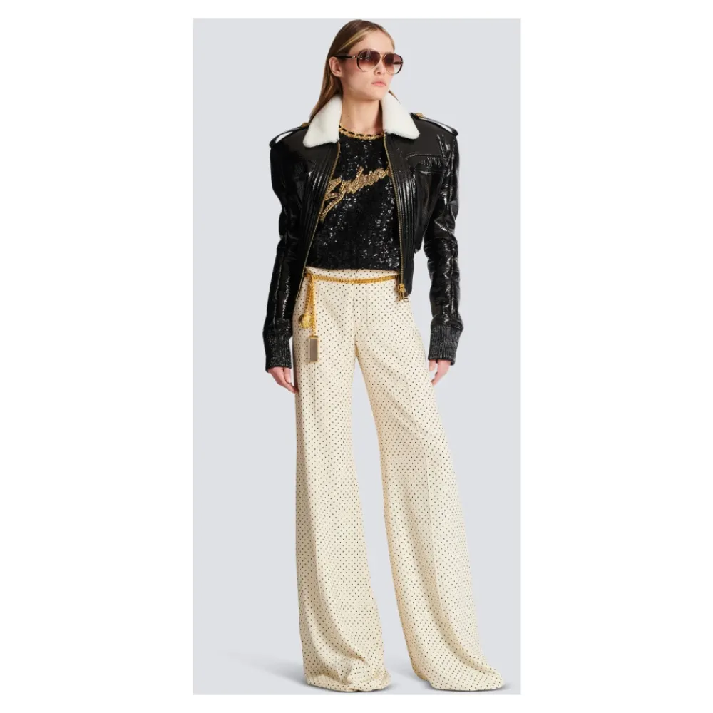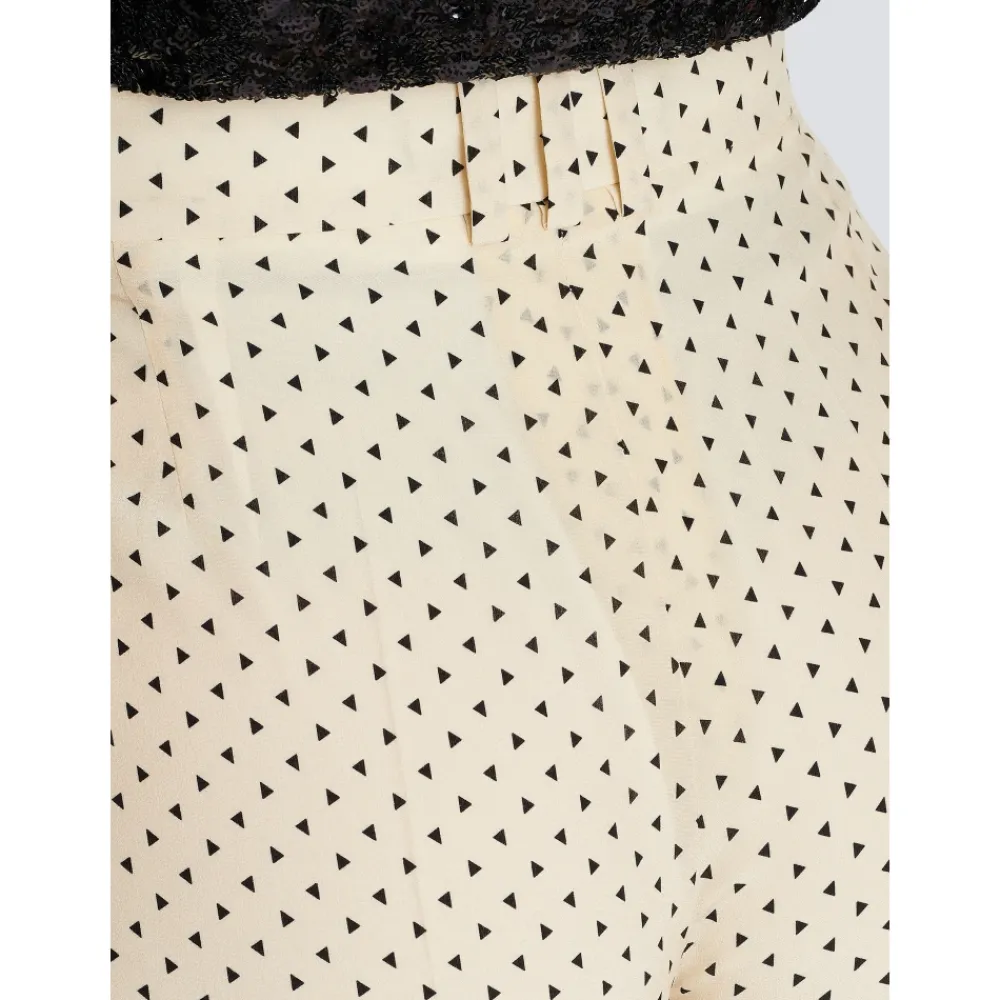 Wide-leg silkebukser med kontrasterende mini trekantstryk. Afslappet, flydende pasform. Høj talje. Lukkes med gylden metal lynlås og krog foran. Triple bæltestrop bagpå. Modellen måler 175 cm og bruger en størrelse 36. Materiale: 100% silke. Lavet i Italien. Vare: BF1PP180SC68.