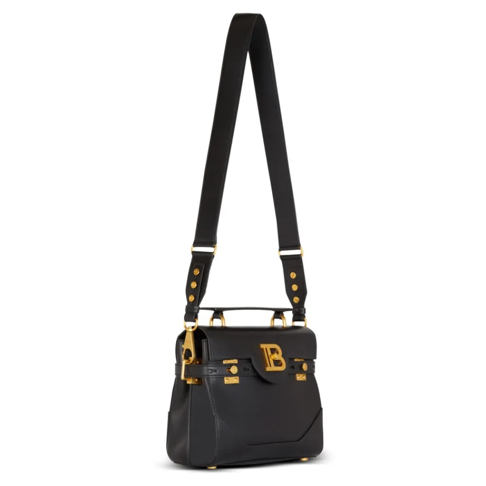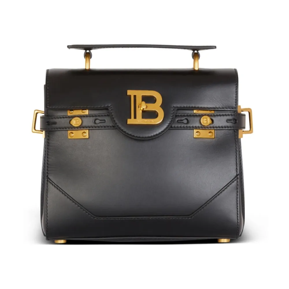 Forøg din stil med denne sorte Balmain ‘B-Buzz 23’ håndtaske, lavet af glat kalveskind. Med læderhåndtag, aftagelig skulderrem, klap med B-lås og guldbelagt hardware. Hold styr på dine ting med flere lommer og nyd Balmain’s luksuriøse håndværk. Mål: 23 cm x 20 cm x 11 cm.