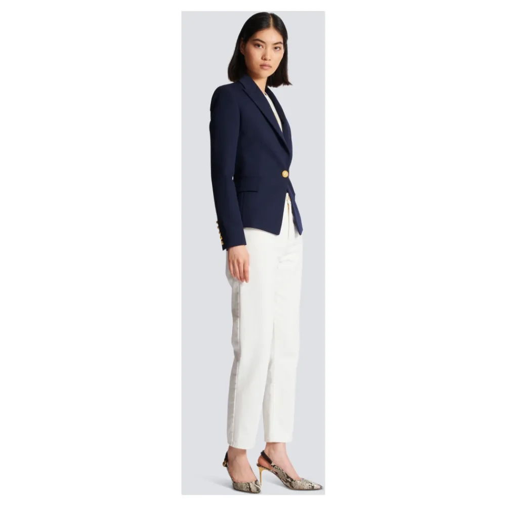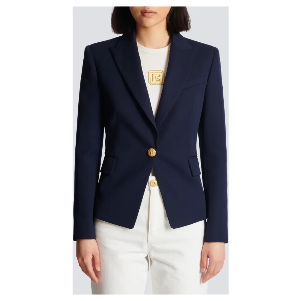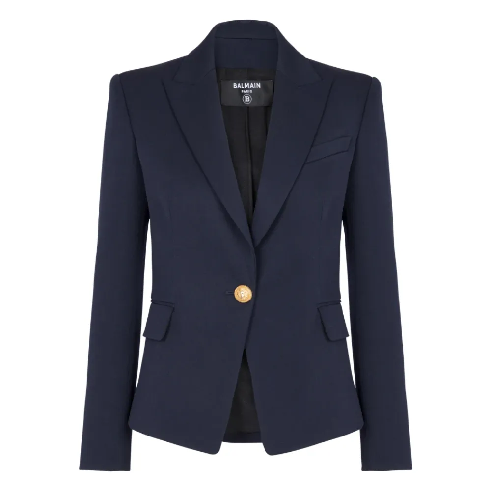 Balmains One-button Wool Blazer tilbyder et struktureret snit med karakteristiske prægede knapper, designet til et elegant kontor- og formelt look. Vigtige egenskaber: Blå | Navy | Uld | Præget knaplukning | To klaplommer | Lange ærmer | Skulderpuder | Prægede knapdetaljer | Mål og pasform: Tætsiddende pasform | Passer normalt i størrelsen (vælg din sædvanlige størrelse) | Modelhøjde: 178 cm | Sammensætning og pleje: 100% uld