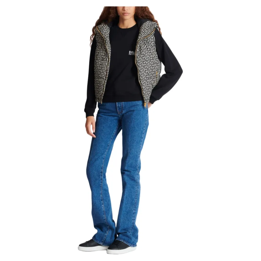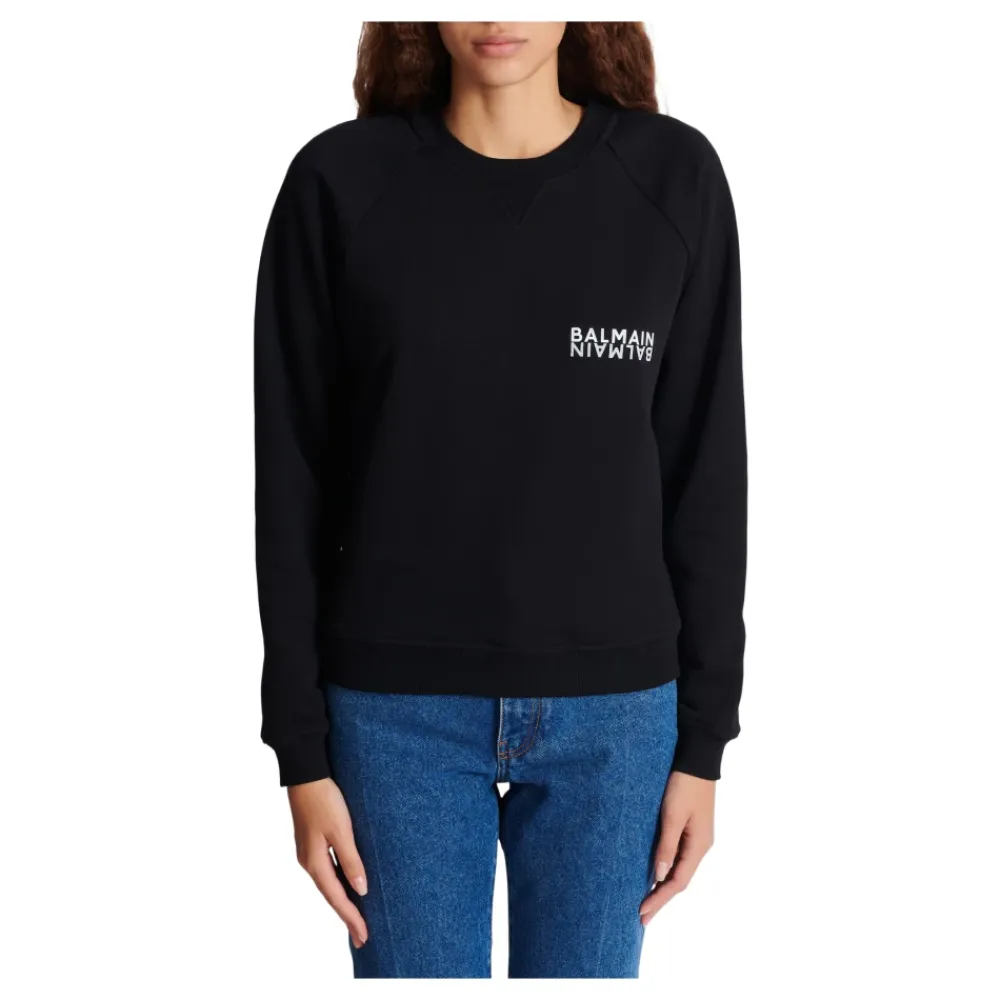 Balmain Logo Sweatshirt er en bomulds sweatshirt med rund hals og et markant, kontrastfarvet logo, designet til et poleret hverdagslook og lag-på-lag. Nøgleattributter: Sort | Bomuld | Rund halsudskæring | Lange ærmer | Kontrastfarvet Balmain logo print | Ribkant | Mål og pasform: Regular fit | Modellen måler 180 cm og bærer størrelse S | Sammensætning og pleje: 100% bomuld
