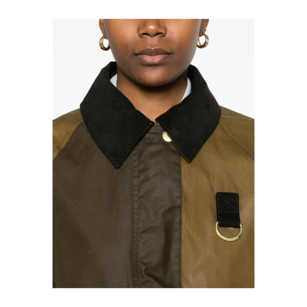 Barbour olivenbrun let jakke til kvinder med front trykknap og lynlås lukning, to forlommer, corduroy krave og lange raglanærmer.