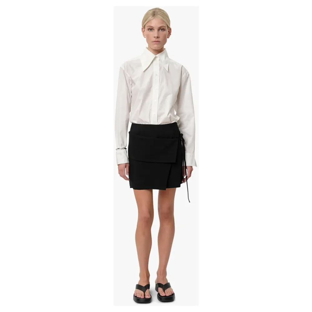 Birgitte Herskinds Yana Skirt er en asymmetrisk mini-nederdel, der defineres af en ekstra slå-om effekt, som bindes i siden, hvilket giver en moderne og markant silhuet til både dag- og aftenbrug. Vigtige egenskaber: Sort | Viskose | Sidebindelukning | Slå-om panel detalje | Asymmetrisk kant | Slå-om stofdetalje | Mini længde | Sammensætning & pleje: 100% viskose
