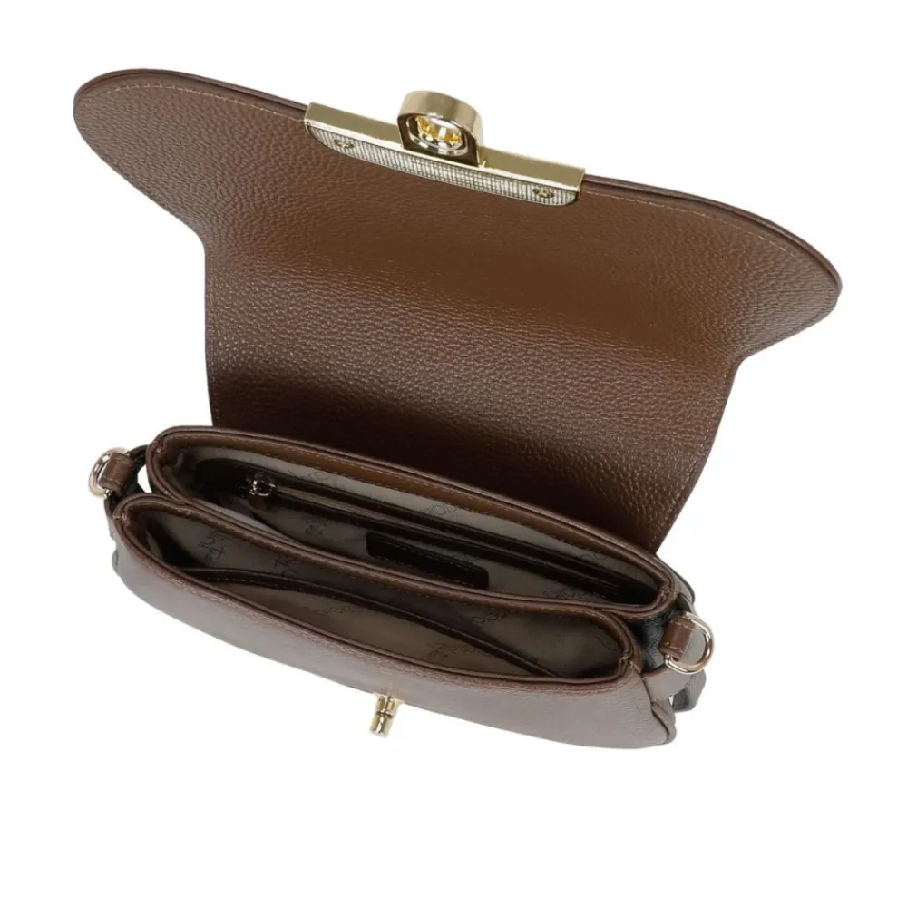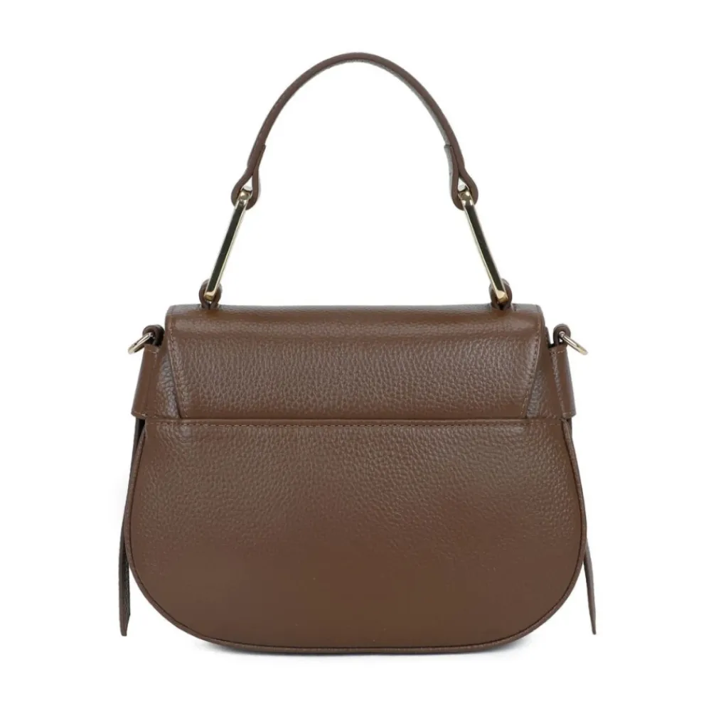 Braccialini Michelle Håndtaske kombinerer blødt kalveskindslæder med en kompakt, rund silhuet og en guldfarvet drejelås, hvilket giver mulighed for alsidig brug fra dag til aften med både tophåndtag og crossbody. Nøgleattributter: Brun | Marrone | Læder | Tophåndtag | Justerbar, aftagelig skulderrem | To indvendige rum | Indvendig lynlåslomme og åben lomme | Frontklaplukning med dreje-/drejelås | Frontklap med guldfarvet drejelås | Afrundet, kompakt silhuet | Sidekiler for struktur | Guldfarvet hardware | Mål & pasform: 22 × 17 × 8 cm | Håndtagshøjde: 12 cm | Sammensætning & pleje: Kalveskindslæder