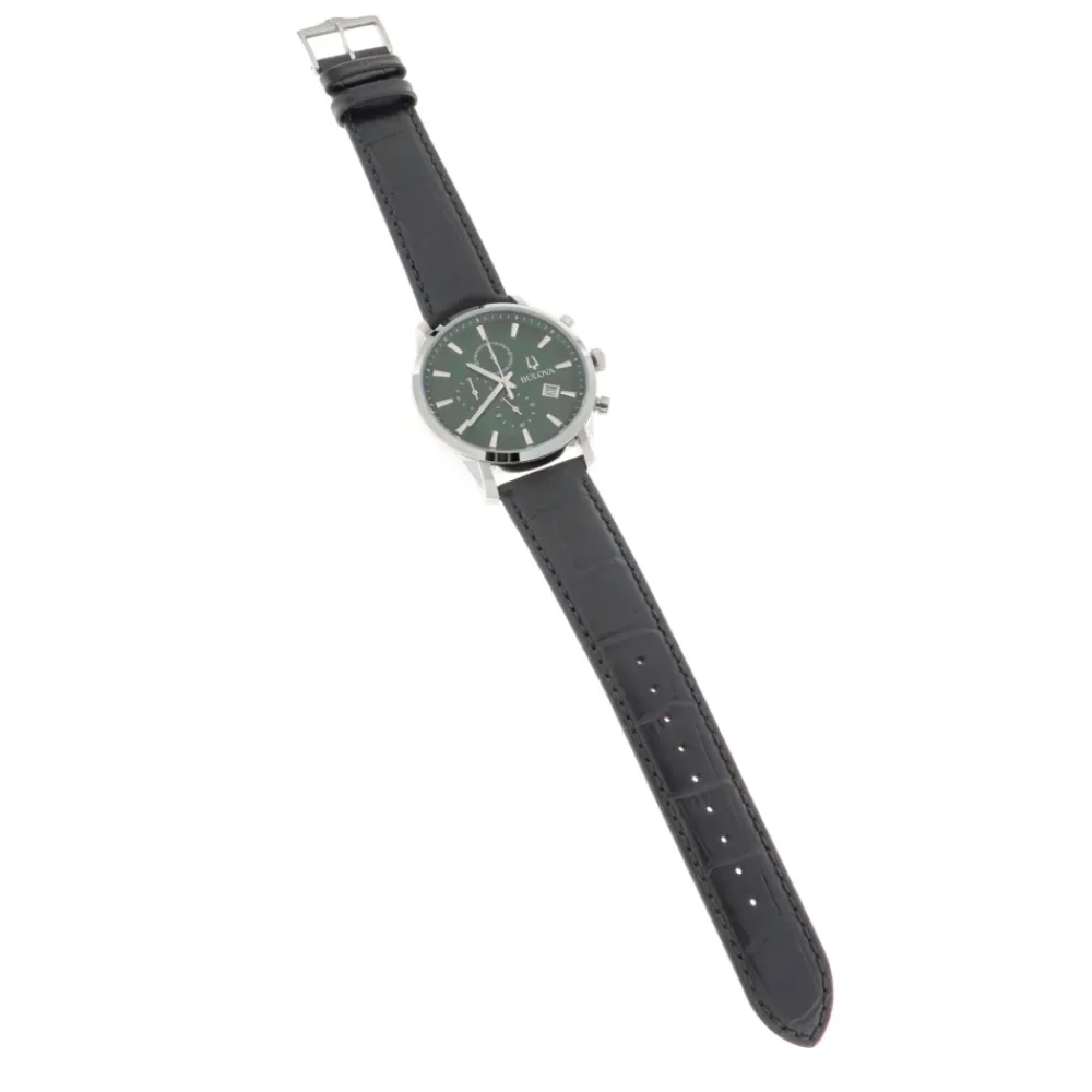 Bulova Sutton Chronograph kombinerer en grøn urskive med et urkasse i rustfrit stål og en sort læderrem for at levere en alsidig hverdags-kronograf med tydelig læsbarhed og praktiske funktioner. Nøgleattributter: Grøn | Sort | Sølv | Rustfrit stål | Vandafvisende | Quartz urværk | Kronograf | Datovisning | Læderrem med foldelås | Grøn urskive | Sølvfarvet urkasse i rustfrit stål | Mineralglas | Dimensioner og pasform: Urkassediameter: 41 mm | Urkassetykkelse: 9,7 mm | Sammensætning og pleje: Rustfrit stål | Læder | Mineralglas