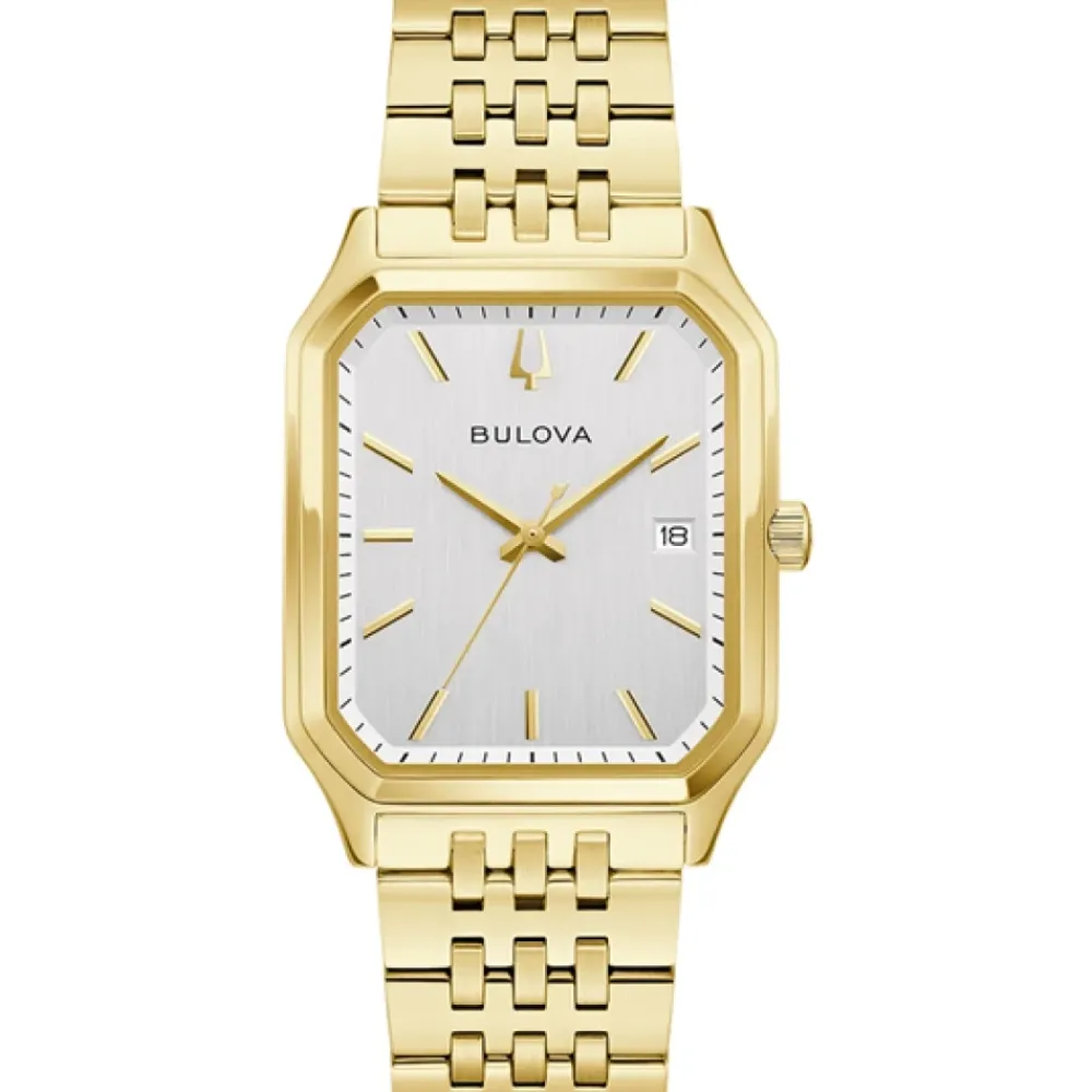 Bulova We Are All Here er et raffineret dress watch, der kombinerer en guldfarvet urkasse og armbånd i rustfrit stål med en vertikalt børstet sølvfarvet urskive. Designet som en hyldestudgave, kombinerer det slanke profiler med hverdagsdriftssikkerhed. Vigtige egenskaber: Guld | Sølv | Rustfrit stål | Vandafvisende 3 ATM (stænktæt) | Quartz urværk (Caliber 9U13) | Antireflekterende safirglas | Datofunktion | Foldelås med trykknapper | Justerbar armbåndsstørrelse | Guldfarvet urkasse med polerede facetter | Vertikalt børstet sølvfarvet urskive med guldfarvede detaljer | Sekundviserens kontravægt formet som en foldet lommeklud | Slank urkasseprofil | Dimensioner og pasform: Urkassediameter: 32 mm | Urkassetykkelse: 7 mm | Rembredde: 20 mm | Justerbar armbåndsstørrelse tilgængelig | Armbåndet kan tilpasses før forsendelse | Sammensætning og pleje: Urkasse i rustfrit stål | Armbånd i rustfrit stål | Antireflekterende safirglas | Aftørres med en blød klud. Undgå kontakt med kemikalier og langvarig udsættelse for vand. Batteriservice og tilpasning af en autoriseret tekniker eller forhandler.