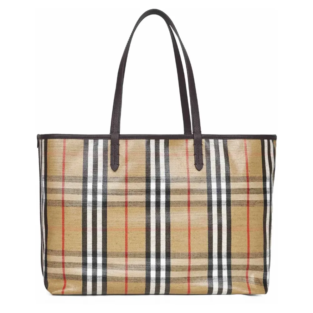 Burberry Highlands Medium Tote kombinerer et belagt Burberry Check-lærred med glatte kalveskindsdetaljer for en struktureret, hverdagsagtig taske. Den har dobbelte læderhanke og en aftagelig pose til organiseret opbevaring. Vigtigste egenskaber: Beige | Sand | Belagt bomulds- og linnedlærred | Belagt finish | Trykknaplukning | Dobbelte lange læderhanke | Enkelt hovedrum | Aftagelig pose med trykknaplukning | Uforet interiør | Lædermærke med Equestrian Knight-design foran | Burberry Check jacquard-motiv | Håndmalede kanter | Glatte kalveskindsdetaljer | Mål og pasform: 38 x 28 x 16.5 cm | Hankefald: 24 cm | Sammensætning og pleje: 69% Bomuld | 21% Viskose | 10% Linned | Kalveskind (detaljer)