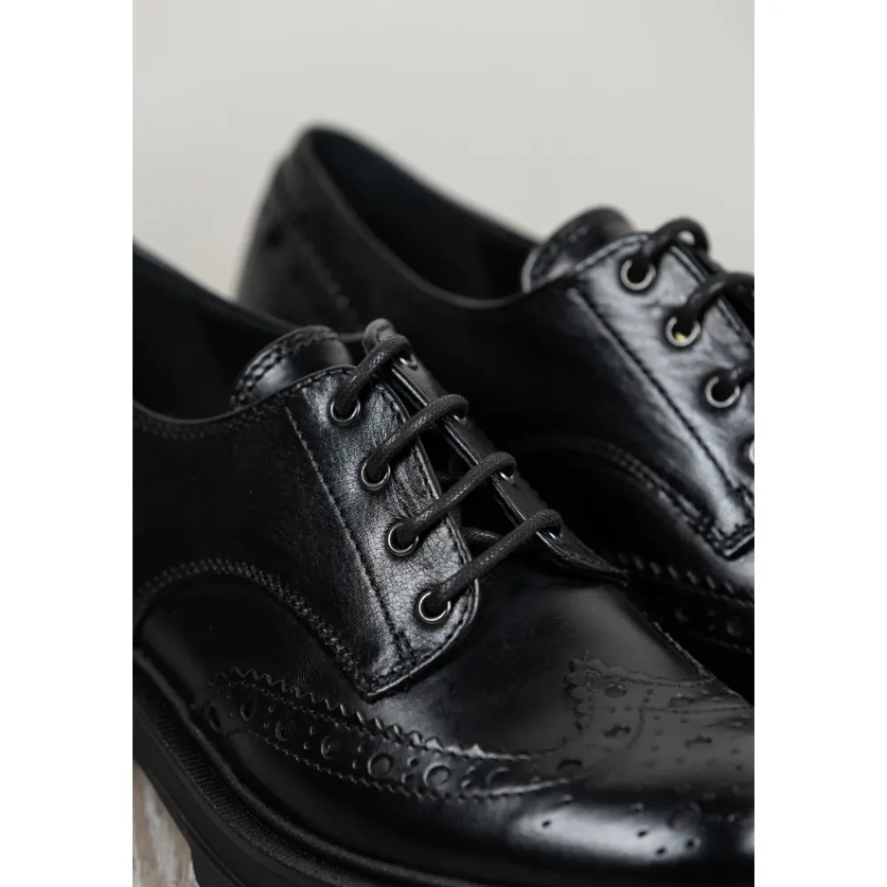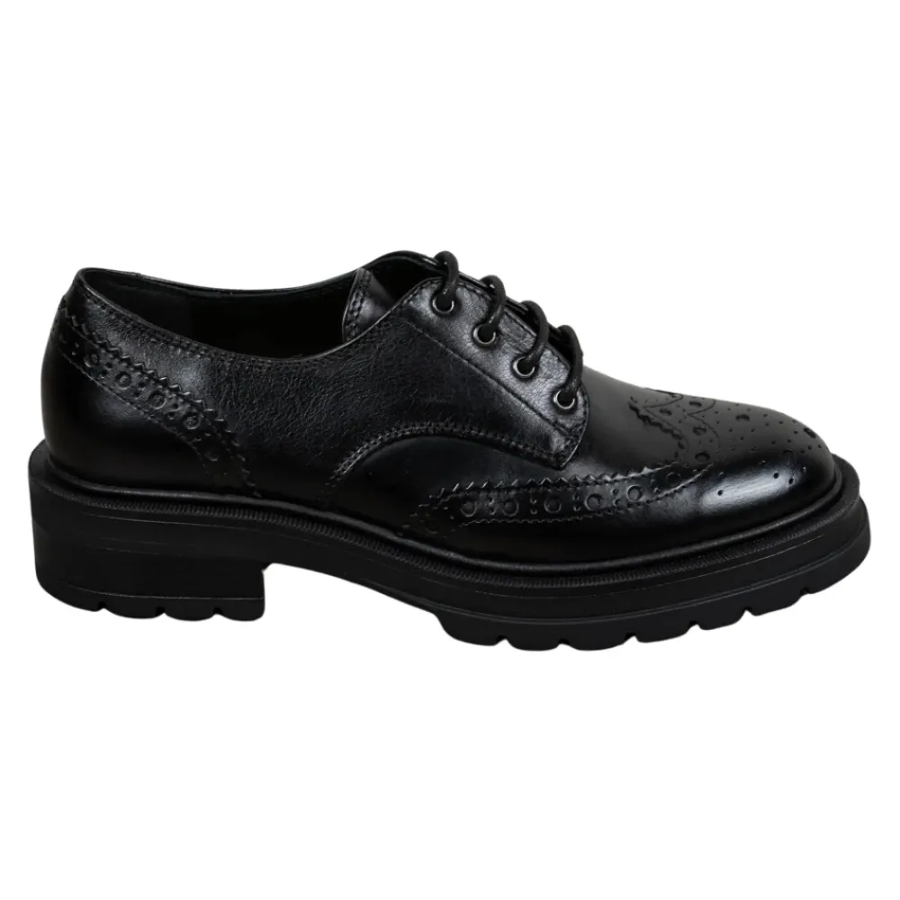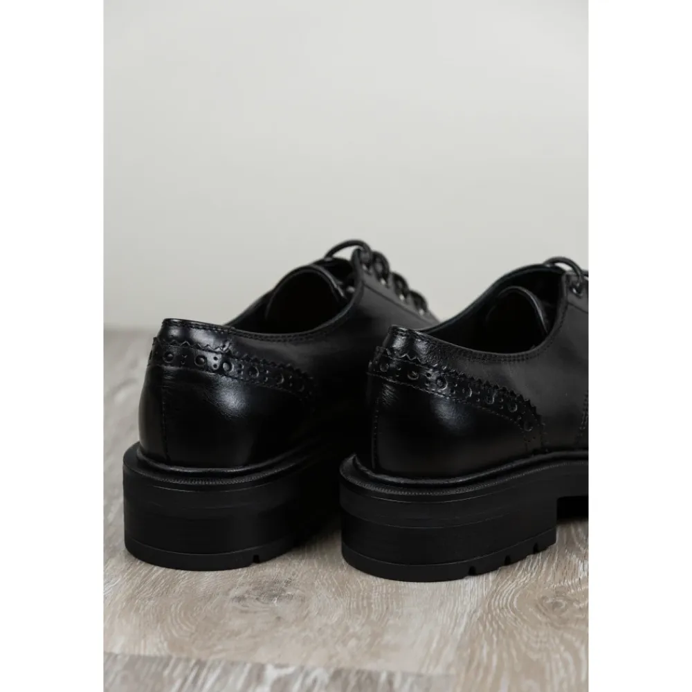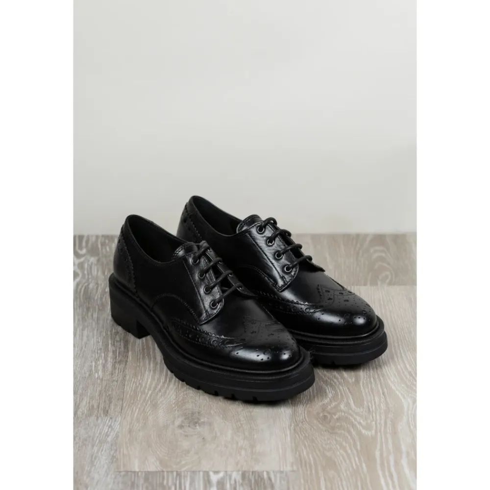 Carmens Patty Derby Sierra A56117 er en Oxford-inspireret snøresko med en chunky, profileret sål, der kombinerer klassisk engelsk stil med blødt kalveskind for hverdagsbrug. Vigtige egenskaber: Sort | Nero | Kalveskindslæder | TR profileret sål for godt fodfæste | Snørelukning | Blødt kid læderfor for komfort | Oxford silhuet | Profileret (carrarmato) sål | Lav blokhæl | Dimensioner og pasform: Hælhøjde: 2 cm | Normal pasform – vælg din sædvanlige skostørrelse. | Sammensætning og pleje: Overdel: Kalveskindslæder | For: Blødt kid (gedeskind) læder | Sål: TR