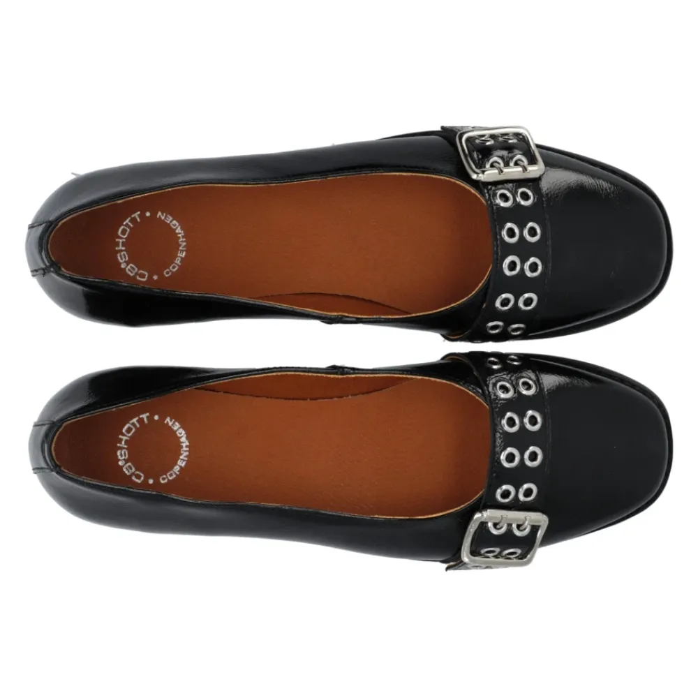 Cashott Copenhagen – DIANA Loafer Patent – Sort Smukke læder ballerina loafers til kvinder fra Cashott Copenhagen. I en klassisk sort farve i patenteret kalveskind. Skoen har en rund tå og en dekorativ rem med spænde over forfoden. Den smukke DIANA ballerina skaber den perfekte balance mellem et rock-look og feminin elegance. Godt at vide: – Hælhøjde: 1,5 cm – Rund tå – Håndlavet i Portugal Pasform: Normal i størrelsen Materiale: – Overdel i blødt patentlæder fra LWG-certificeret garveri – Åndbar og CO’2-venlig mikroforing – Ydersål lavet af gummi Style nr.: 61201984_Black.