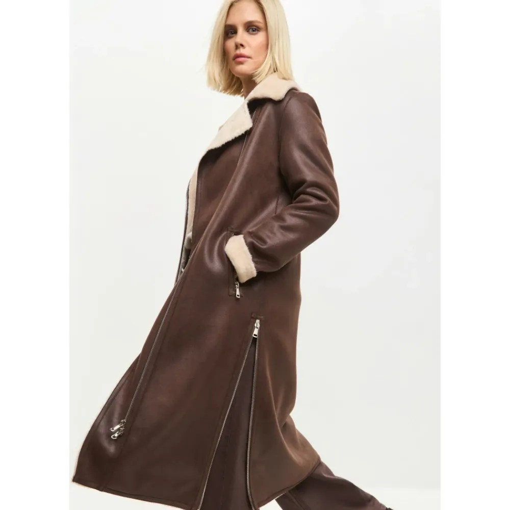 Denne iøjnefaldende brune faux shearling frakke kombinerer elegance og praktisk anvendelighed. Med en moderne lynlåslukning og et taljebælte giver den en skræddersyet silhuet med maksimal varme og komfort fra faux fur-foret. Produkt detaljer: Brun | Faux læder (polyesterblanding) | Justerbart taljebælte | Reversibelt design | Stor reverskrave med faux fur-accenter | Sideslidser med lynlås | Langt design | Dimensioner og pasform: Skræddersyet pasform | Sammensætning og pleje: Ydermateriale: Faux læder (polyesterblanding) | Indvendig foring: Blød faux shearling 43% modakryl 36% polyester 21% akryl | Renseri anbefales