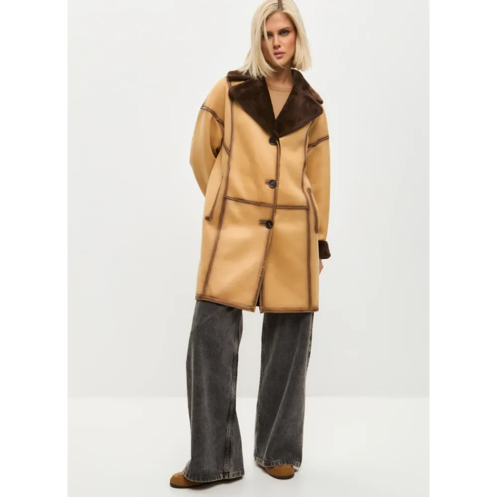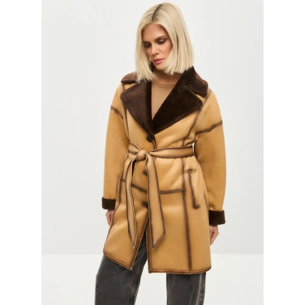 Denne iøjnefaldende knaplukket lange frakke i imiteret materiale kombinerer elegance og praktisk anvendelighed. Med en knaplukning og et taljebælte giver den en skræddersyet silhuet med maksimal varme og komfort fra imiteret pelsfor. Produkt detaljer: Lys Brun | Brun | Imiteret Læder (Polyesterblanding) | Vendbar | Justerbart taljebælte | Stor reverskrave med imiteret pelsdetaljer | Langt design | Sammensætning og pleje: 43% Modakryl | 36% Polyester | 21% Akryl | Ikke specificeret