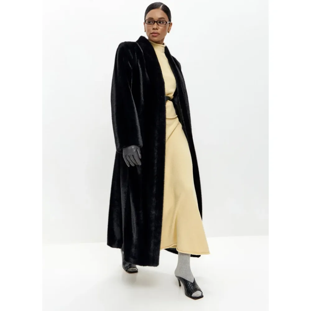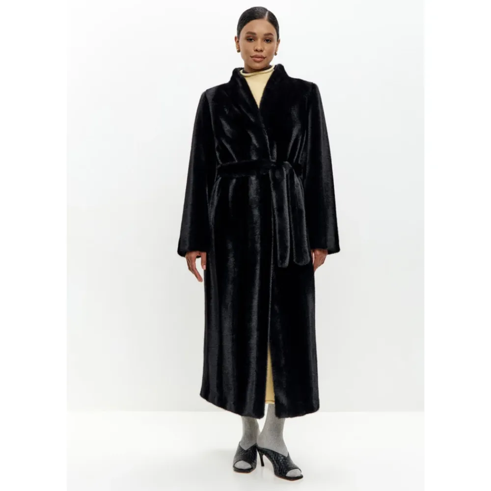 Det ultimative vinterstatement – elegant, dramatisk og uforglemmeligt. Den falske pelsfrakke er designet til at tiltrække opmærksomhed. Dens fulde længde på 125 cm, skulpturel krave og tonal bælte skaber en lang, ren silhuet med kraftfuld tilstedeværelse. Udført i dyb sort med en skåret finish, tilbyder den varme, blødhed og elegance på redaktionelt niveau. Fuld længde bæltet falsk pelsfrakke med skulpturel krave Skal og foring: 100% polyester Farve: Dyb sort med subtil glans Længde: 125 cm Lange ærmer med 4 cm forlængelse og 10 cm foldbar manchet Matchende stofbælte til at forme taljen Rens kun Tilsæt slimede strik eller gulvlange kjoler for et efter-mørkt look. Et samlerobjekt med tidløs indvirkning.