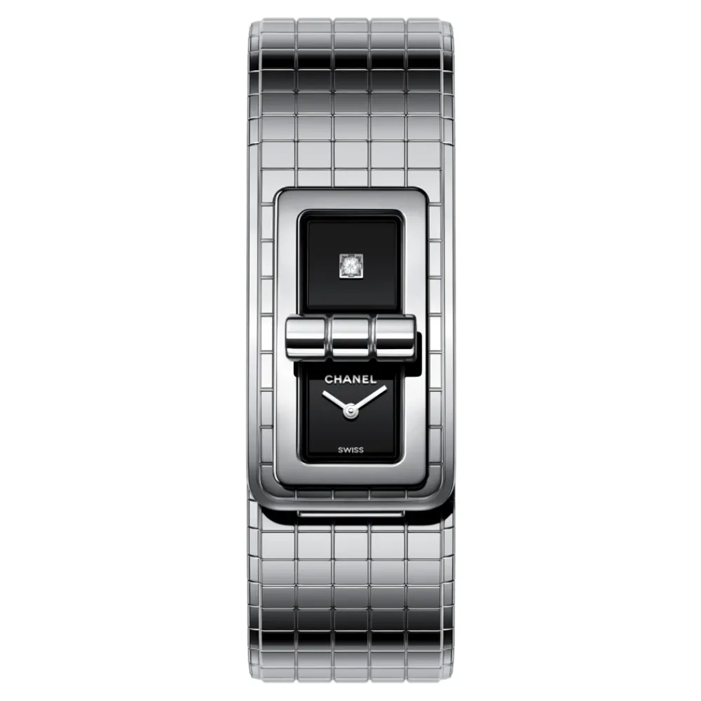Chanel Code Coco Armbånd er et ur i smykkestil, der kombinerer en rektangulær urkasse i rustfrit stål med sortlakerede urskiver – den ene med en princess-cut diamant – til raffineret festtøj og særlige lejligheder. Nøgleattributter: Sort | Stål | Rustfrit stål | Vandafvisende til 30 m (3 ATM) | Safirkrystal | Armbånd i rustfrit stål med foldelås | Quartz-urværk for minimal vedligeholdelse | Rektangulær urkasse | Sortlakeret urskive | En urskive med en princess-cut diamant (~0,05 ct) | Slank profil | Dimensioner og pasform: 38,1 x 21,5 mm | Sammensætning og pleje: Urkasse i rustfrit stål | Armbånd i rustfrit stål | Safirkrystal | Princess-cut diamant (~0,05 ct) | Quartz-urværk | Aftørres med en blød klud. Undgå nedsænkning ud over vandtæthedsvurderingen. Få urværket serviceret af en autoriseret tekniker.