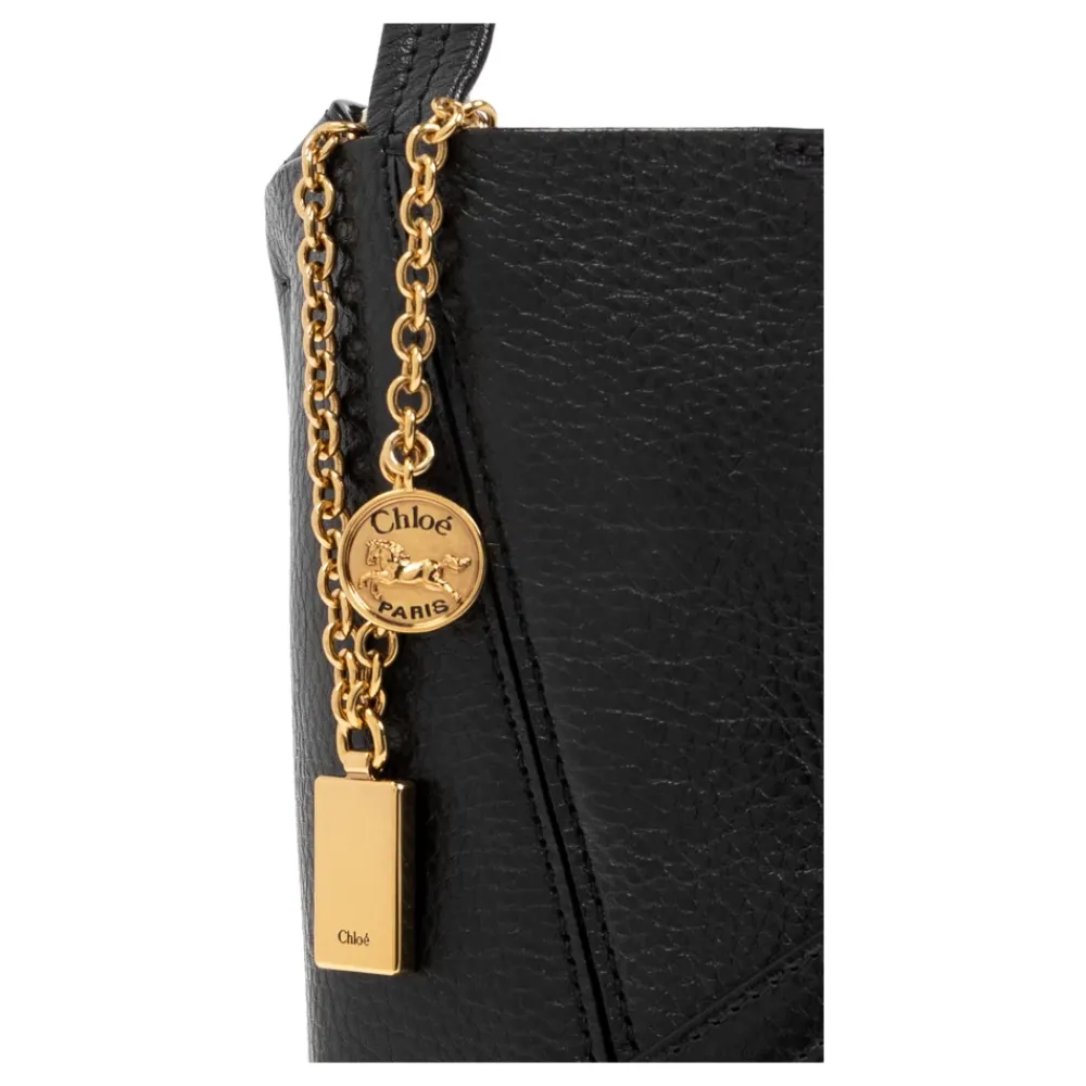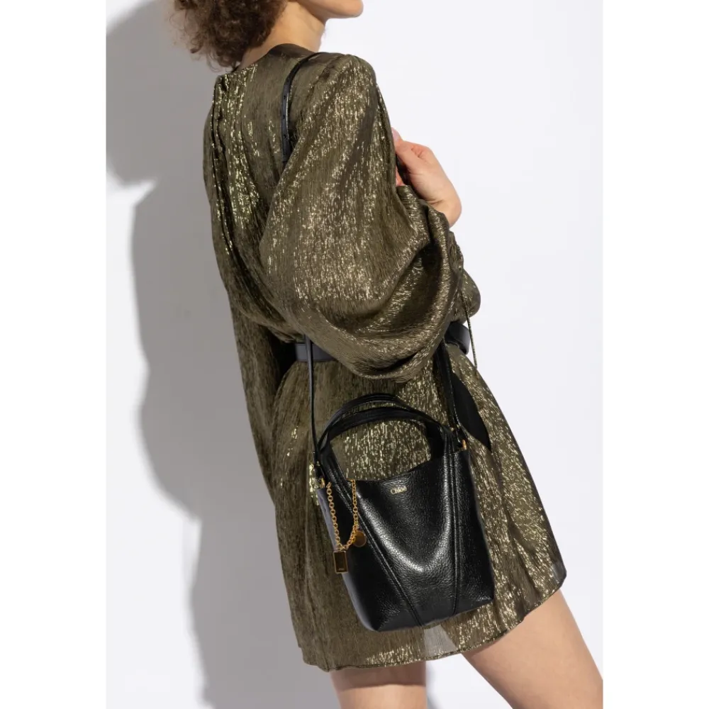 Vi præsenterer Spin-håndtasken fra Chloé, en luksuriøs bucket bag, der kombinerer elegance og funktionalitet med sin rektangulære, let afrundede form. Produkt detaljer: Sort | Tekstureret læder | Lang skulderrem | To kortere hanke | Diskret guld Chloé-logo | Guldkæde med charms | Dimensioner og pasform: Højde: 29 cm | Bredde på det bredeste punkt: 21 cm | Bundbredde: 8 cm |