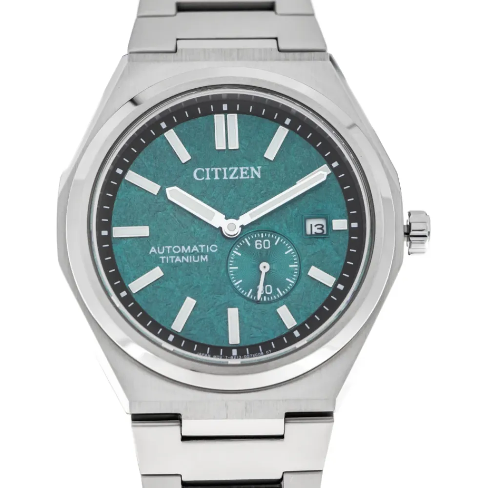 Citizen Zenshin Super Titanium er et automatisk ur, der kombinerer en tekstureret grøn urskive med en let, ridsefast Super Titanium-konstruktion. Det skiller sig ud med sit lille sekund-layout og robuste 10 bar vandtæthed, der er velegnet til hverdagsbrug og svømning. Nøgleattributter: Grøn | Sølv | Titanium | Vandtæt 10 bar (100 m) | Safirkrystal | Holdbar Super Titanium-finish | Automatisk urværk (selvoptrækkende) | Lille sekundviser ved 4–5 o’clock | Datovisning | Tekstureret grøn urskive | Rund urkasse | Transparent udstillingsbagkasse | Børstet og poleret finish | Dimensioner & pasform: Urkassediameter: 40 mm | Sammensætning & pleje: Titanium | Safirkrystal | Aftørres med en blød klud. Undgå udsættelse for stærke kemikalier og ekstreme stød. Få vandtæthed og urværk serviceret regelmæssigt af et autoriseret servicecenter.