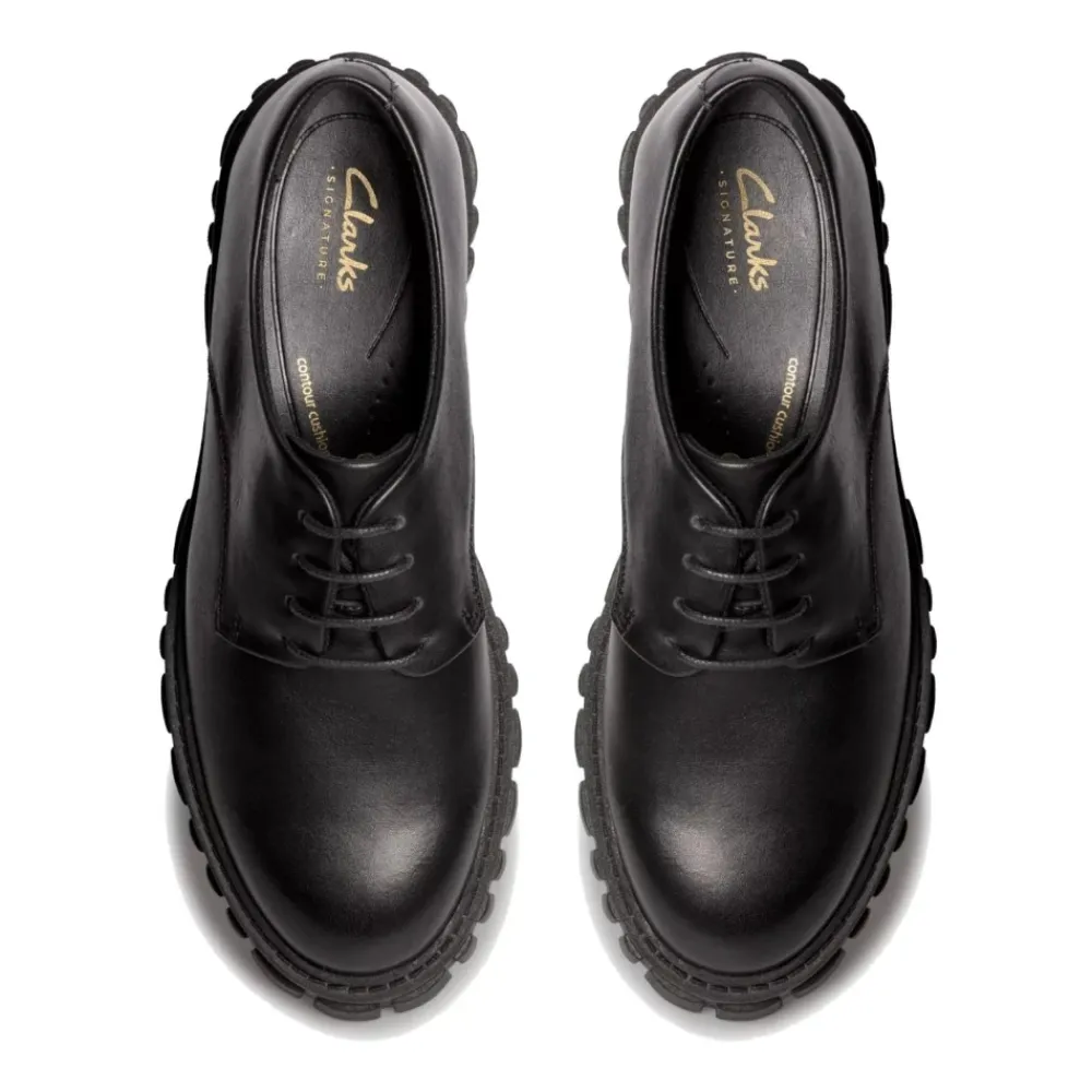 Oplev den perfekte blanding af stil og komfort med disse sorte lædersko med snørebånd fra Clarks, der har en Contour Cushion indersål og en markant ydersål med nitter. Produkt detaljer: Sort | Læder | Tonal snørelukning | Tekstilforing | TR ydersål med nitter | 4,5 cm hæl | Dimensioner og pasform: Flatterende pasform |
