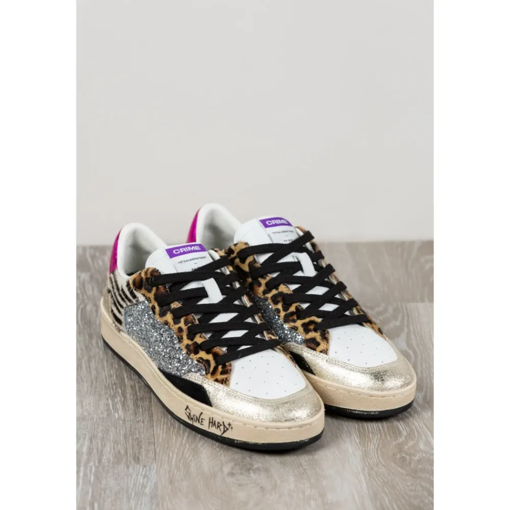 Crime London Chelsea sneaker, der kombinerer sølvglitter og kalvehair med animalier-print med metalliske hældetaljer for en dristig hverdagssneaker med vintage-effekt. Vigtigste egenskaber: Multicolor | Bianco | Animalier | Læder | Snørelukning | Læder- og tekstilfor | Gummisål | Overdel i sølvglitter | Leopard kalvehair-detaljer | Zebra kalvehair-indsats | Hindbærfarvet metallisk hælstrop | Guld krakeleret hæl med CRIME-logo | Hvid læderpløs med logo-stofmærke | Vintage finish | Mål og pasform: Sålhøjde: 2,5 – 3 cm | Almindelig pasform | Sammensætning og pleje: Overdel: glitter, kalvehair, læder | For: læder, tekstil | Sål: gummi | Snørebånd: bomuld