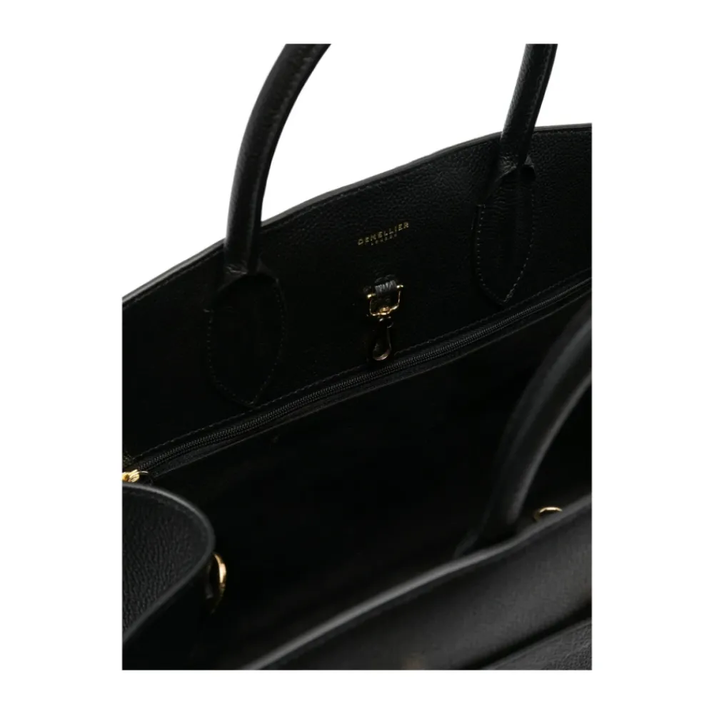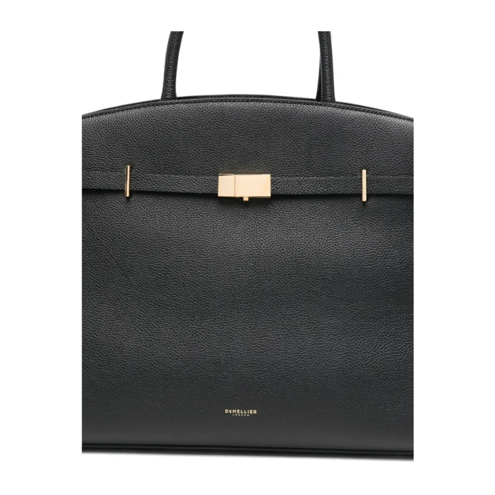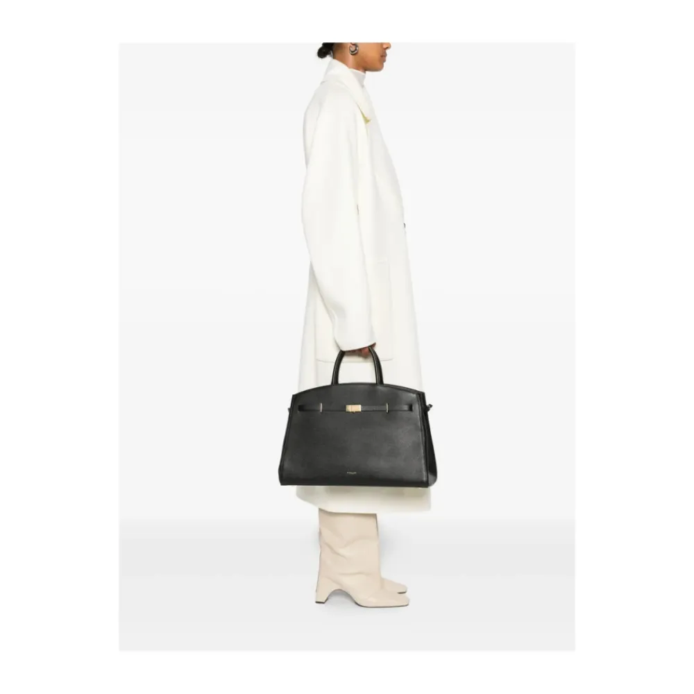 DeMelliers The Hudson er en struktureret taske med tophåndtag, fremstillet i kalveskind og defineret af en bæltestrop og guldfarvet hardware. Den er designet til hverdagsorganisering med alsidige bæremuligheder. Vigtige egenskaber: Sort | Kalveskind | Tophåndtag | Spændefastgørelse | Hundeklips lukning | Aftagelig, justerbar skulderrem | Åben baglomme | Indvendig lynlåslomme | Beskyttende fødder | Struktureret trapezformet silhuet | Dekorativ bæltestrop | Buet topkant | Rørformede tophåndtag | Guldfarvet hardware | Dimensioner og pasform: Dybde: 15,0 centimeter | Håndtag: 10,0 centimeter | Højde: 25,0 centimeter | Bredde: 40,0 centimeter | Sammensætning og pleje: Kalveskind | Bomuldsfor