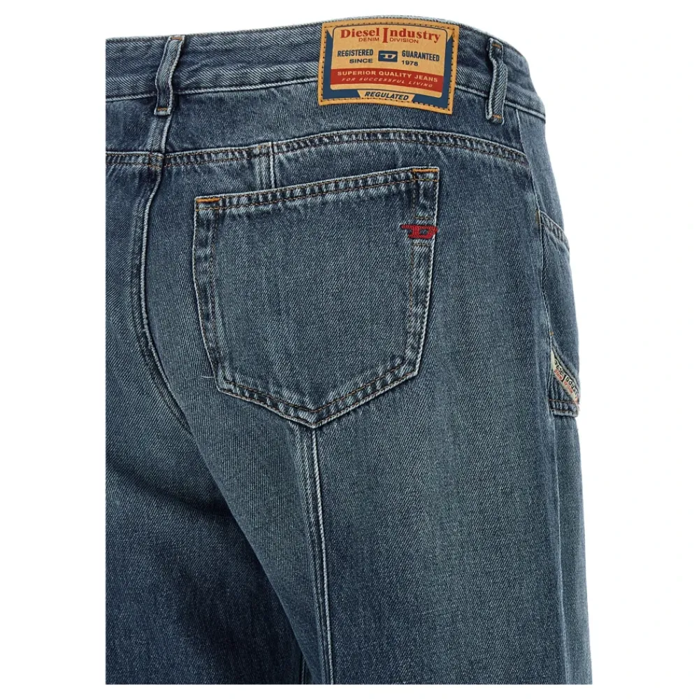Diesel D-Akii 09m56 jeans leverer en markant, udvidet silhuet med lav talje og ekstra brede ben. Konstruktionen i stonewashed bomuld og de karakteristiske logo-detaljer gør dem til et enestående valg til afslappet og udtryksfuld påklædning. Vigtige egenskaber: Medium blå | Bomuld | Lynlås og knaplukning foran | Skrålommer | Lav talje | Ekstra brede, udvidede ben | Stonewashed finish | Logo broderi bagpå | Logo tag | Dimensioner og pasform: Normal pasform | Materiale og pleje: Bomuld | Maskinvask kold, tørretumbles ved lav varme, stryges ved lav varme.