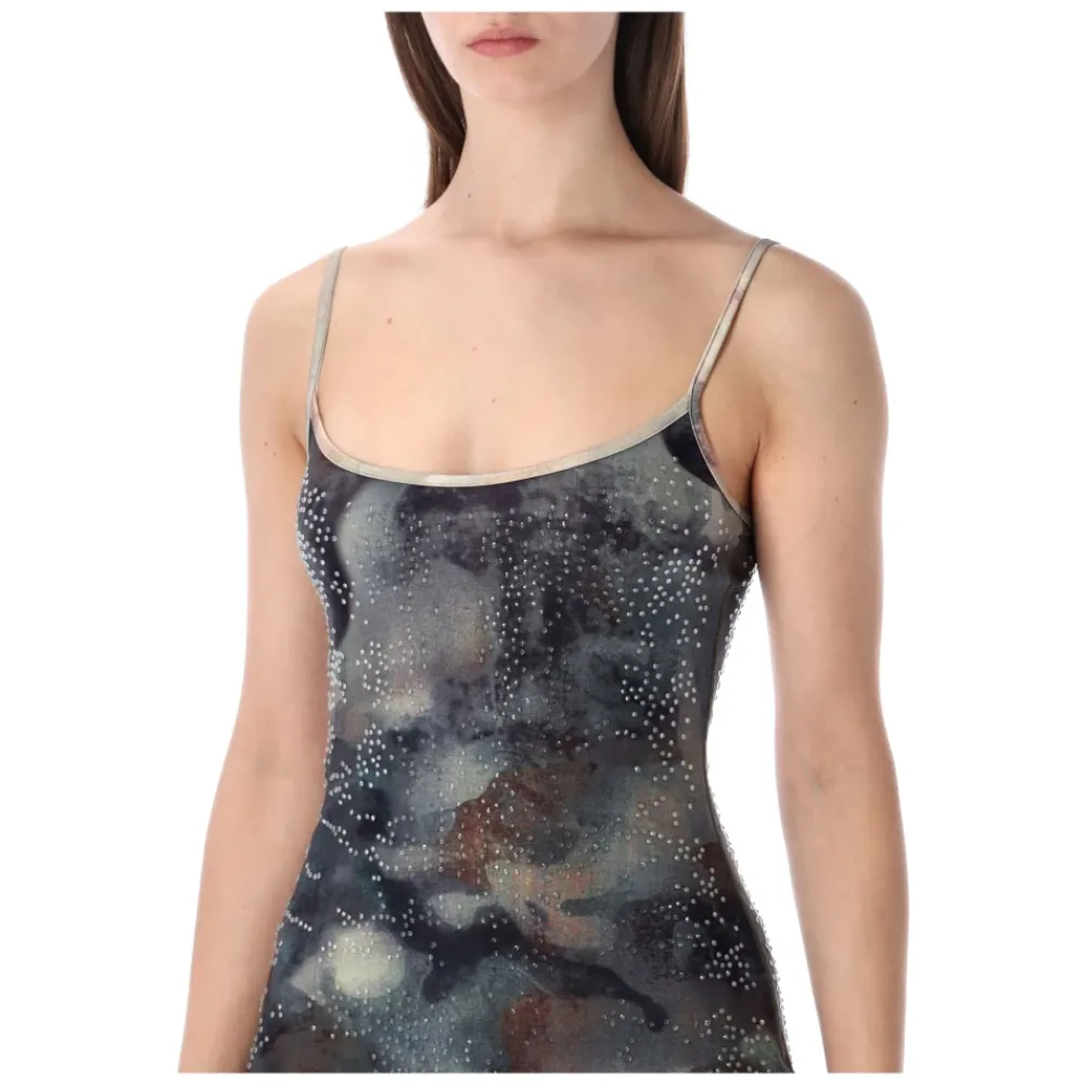 Diesel D-Loop Mini Dress Crystal er en krystalbesat mini kjole, der tilføjer glimmer til looks fra dag til nat. Designet omkring den karakteristiske D-Loop detalje, fungerer den som et bemærkelsesværdigt stykke til events og stylede hverdagsoutfits. Nøgleattributter: Flerfarvet | Blå camouflage | Krystalbesætning | Mini længde | D-Loop logo detalje