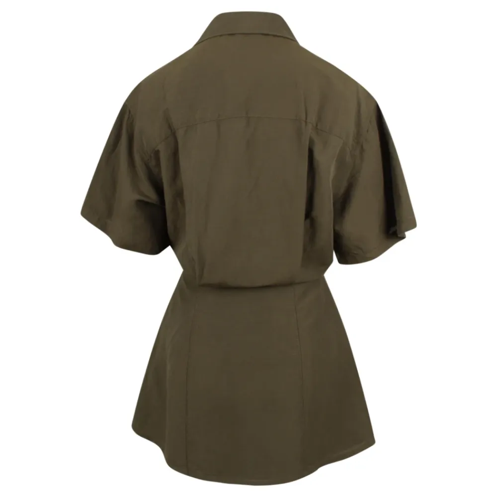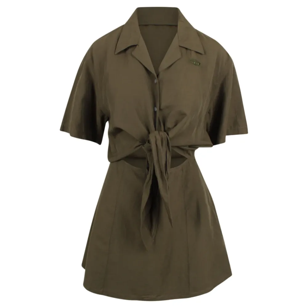 Diesel’s D-STALL Mini Kjole er en skjortekjole i linnedblanding med en knudedetalje i taljen, designet til let brug fra dag til nat. Skjortekraven og den knudeforreste silhuet tilføjer et feminint touch, samtidig med at den bevarer en nem, brugbar form. Vigtige egenskaber: Grøn | Linnedblanding | Let | Åndbart stof | Knaplukning foran | Usynlig lynlås i siden | Taljeknude for justerbar pasform | Skjortekrave | Brede, korte ærmer | Udskåret talje med knudedetalje | Udskåret miniskørt | Ovalt D-logo på brystet | Knapper med perlemorseffekt | Dimensioner og pasform: Almindelig pasform | Justerbar taljeknude | Sammensætning og pleje: 49% Modal | 26% Viskose-Rayon | 25% Linned