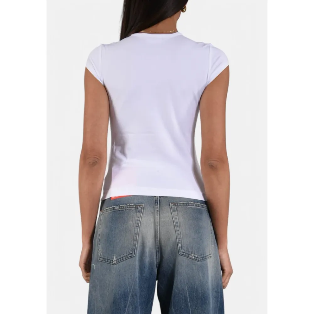 Opgrader din garderobe med Diesel Cotton Stretch T-Angie T-shirt, der har et elegant laserskåret og broderet logo på brystet for et moderne touch. Produkt detaljer: Hvid | Bomuldsblanding | Strækbart stof for komfort | Laserskåret logo | Broderede detaljer | Tætsiddende pasform | Dimensioner og pasform: Tætsiddende pasform | Sammensætning og pleje: 93% bomuld | 7% elastan | Maskinvask kold, tørretumbles ved lav varme