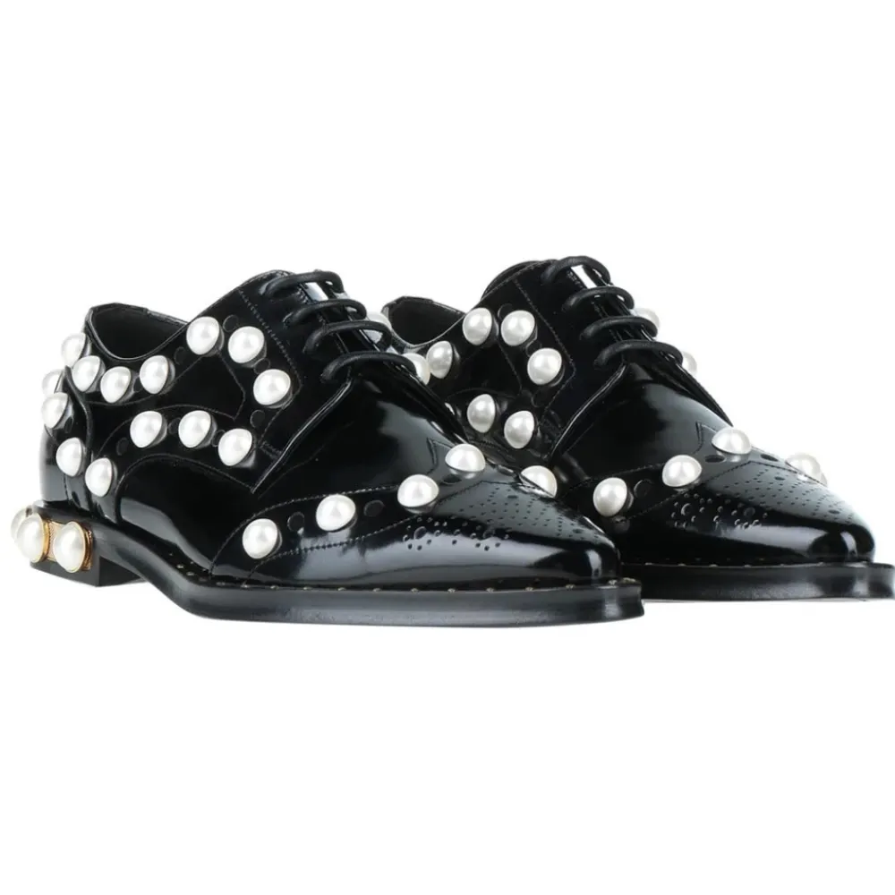 Dolce & Gabbana Derby er en lædersko med snørebånd, afsluttet med hvide perledetaljer og en smal tå. Fremstillet i Italien til et elegant og formelt look. Vigtige egenskaber: Sort | Nero | Læder | Snørelukning | Smal tå | Hvide perledetaljer | Fremstillet i Italien | Sammensætning & pleje: 100% læder