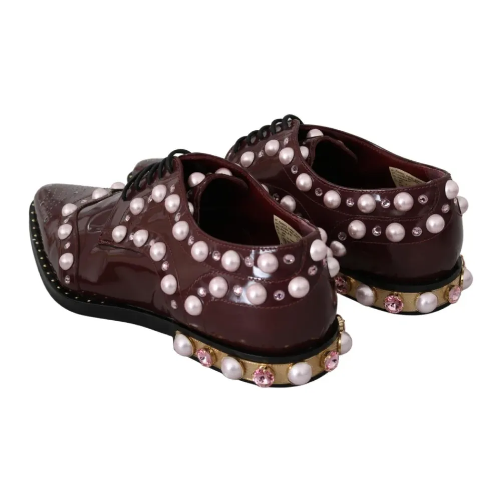 Dolce & Gabbana Pearl Embellished Oxfords er statement snøresko, der kombinerer klassiske Oxford-linjer med perle- og krystaldetaljer for et elegant look. Designet lægger vægt på dekorative detaljer og højt italiensk håndværk. Nøgleattributter: Brun | Bordeaux | Læder | Snørelukning | Lædersål | Perle- og pink krystaludsmykning | Besat læderoverdel | Oxford silhuet | Logo detaljering | Sammensætning & pleje: Læder