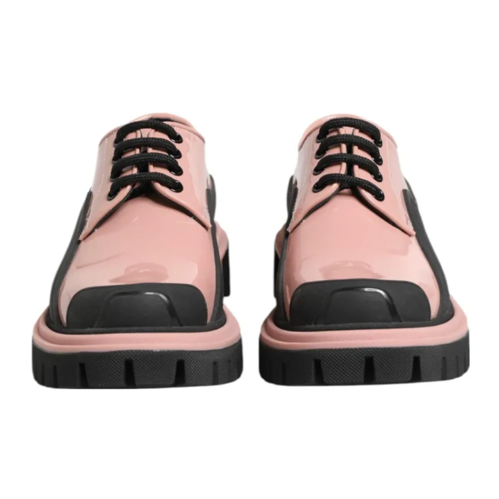 Forhøj din stil med disse Dolce & Gabbana Light Powder Pink Black Leather Lace-Up Shoes til kvinder. Fremstillet af 100% kalvpatentlæder, tilbyder disse flade sko en perfekt blanding af elegance og moderne stil. Den delikate pudderrosa farve med sorte accenter gør dem til et alsidigt tilbehør til enhver garderobe. Snørebåndsdesignet sikrer en god pasform og tilføjer et strejf af sofistikering til dit outfit.