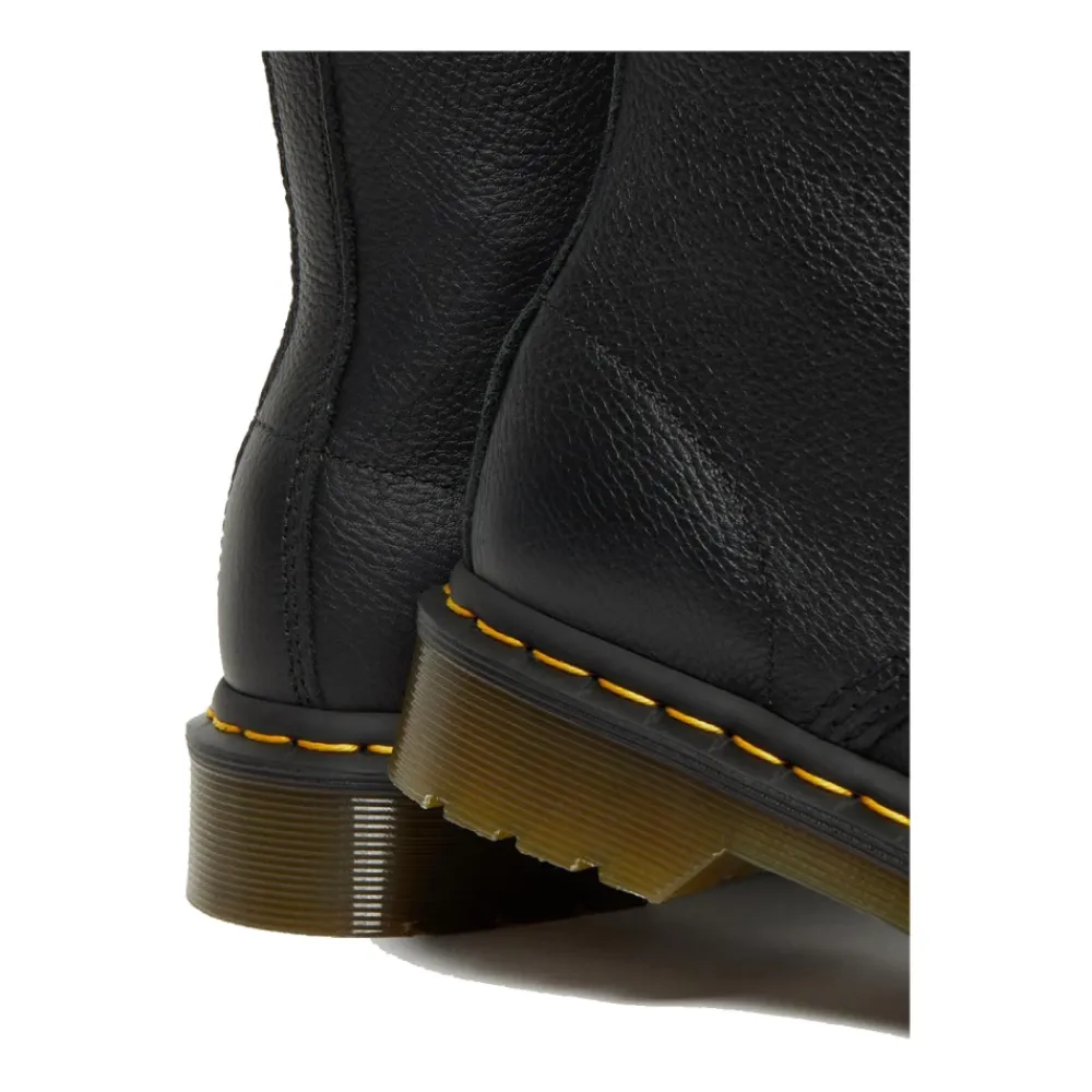 Dr. Martens 1460 Pascal Virginia Ankelstøvler opdaterer den originale 8-øje silhuet med blødt Virginia læder og brandets signatur gule welt syninger for slidstærk, hverdagsbrug. Nøgleattributter: Sort | Virginia læder | AirWair luftpolstret sål (skridsikker) | Slidstærk PVC ydersål med dybt mønster | 8 øjer | Sorte glatte rørformede snørebånd | Læderforing | Goodyear-welted konstruktion | Gule synlige welt syninger | 8-øje snørelukning silhuet | Signatur hælstrop | Sammensætning & pleje: Overdel: 100% læder | Foring: 60% læder, 40% tekstil | Sål: 100% PVC | Tør snavs væk med en fugtig klud og lad tørre. Påfør Dr. Martens Wonder Balsam på ydersiden for at holde læderet smidigt.