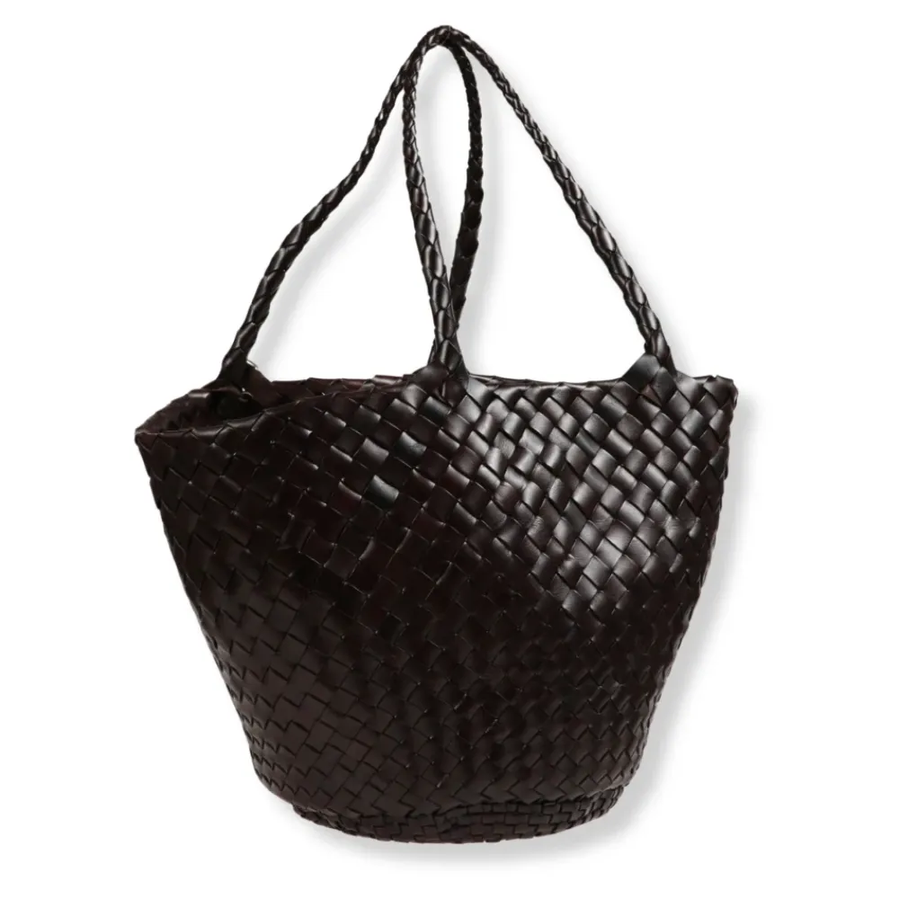 Dragon Diffusion Egola Bag er en håndvævet lædertaske med en kurv-silhuet og flettede tophåndtag, designet til hverdagsbrug med et raffineret, håndværksmæssigt look. Nøgleattributter: Sort | Mørkebrun | Læder | Åben top | Flettede tophåndtag | Kurvformet silhuet | Håndvævet læderkrop | Flettede øvre håndtag | Sammensætning & pleje: Læder