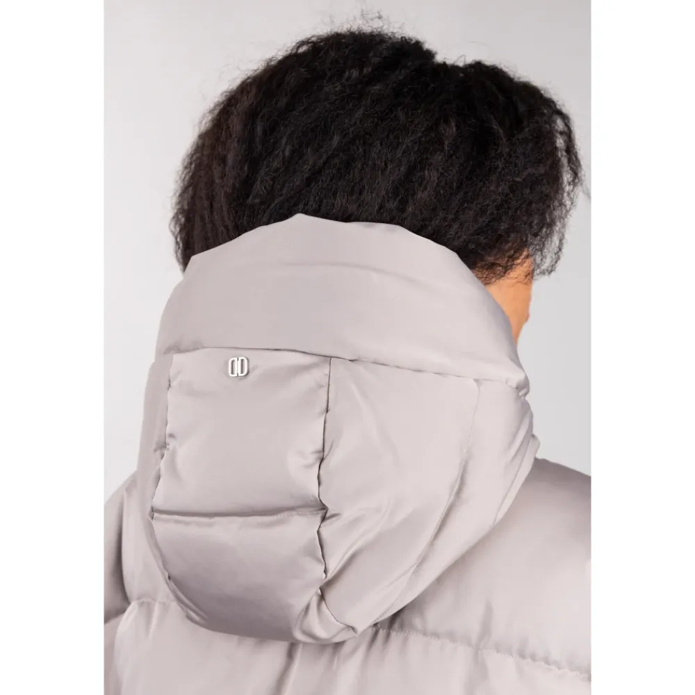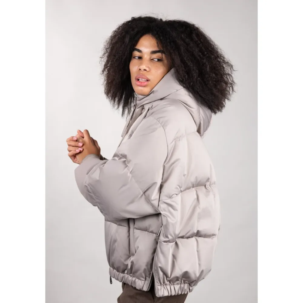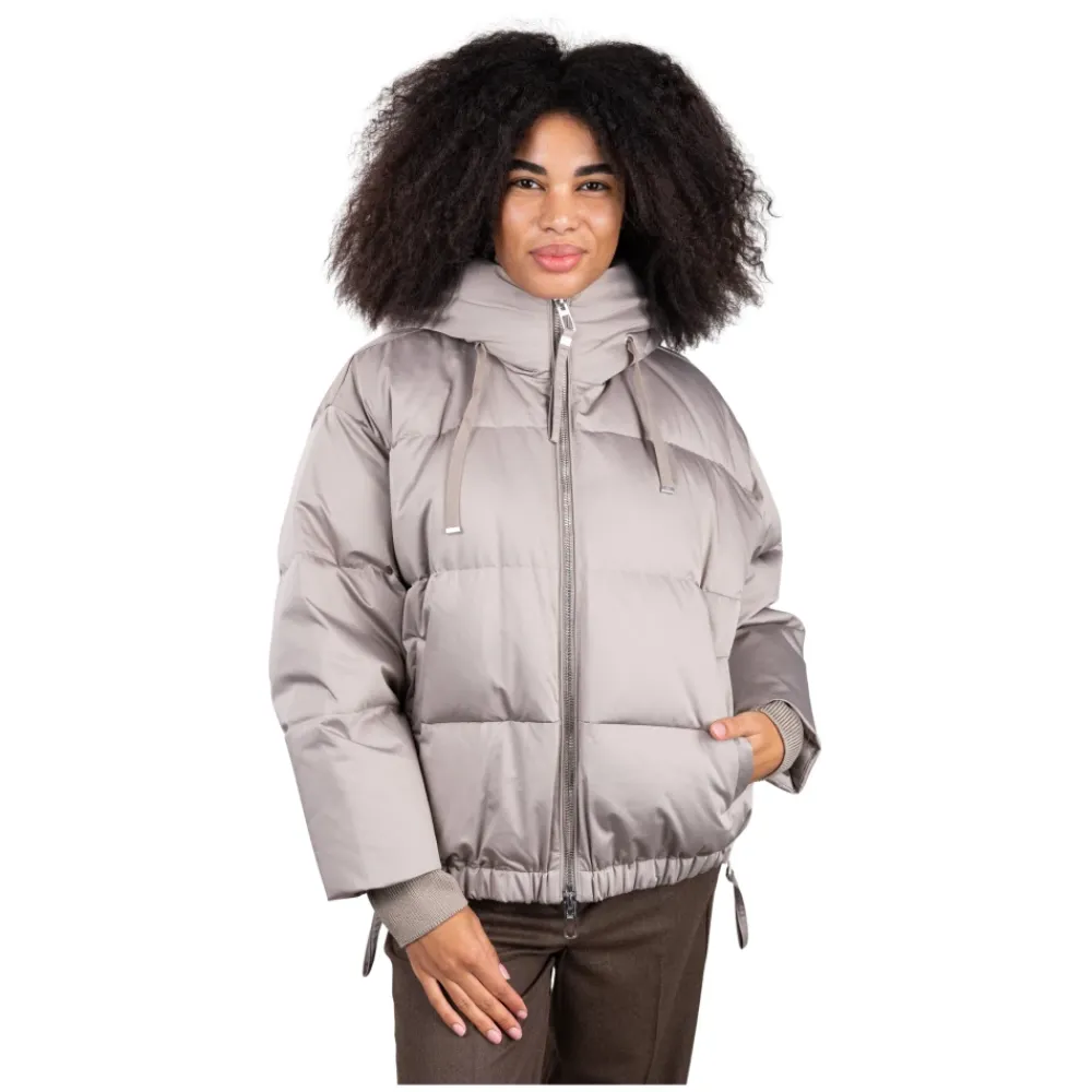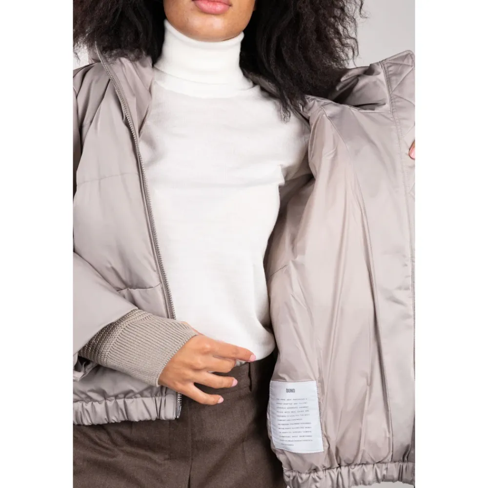 Duno kort oversized dunjakke fremstillet i teknisk satin, med en justerbar hætte og flere lynlåsdetaljer for alsidig brug. Vigtigste egenskaber: Grå | Sabbia bagnata | Teknisk satin | Vandafvisende finish | Strækkomfortstof | Dunfyld for termisk isolering | Vejrbestandig | Justerbar hætte med snøre | Sideslidser med lynlåslukning | Skjult elastisk kant for at stramme kanten ind | Lange uldstrikkede manchetter, der kan omdannes til vanter via tommelfingerhul | Paspolerede sidelommer med skjult trykknap | Dobbeltlynlås foran med træk | Kort oversize silhuet | Satinlignende, silkeagtigt udseende | Lange strikmanchetter med tommelfingerhul | Underlynlås med zigzag-syning | Dimensioner og pasform: Oversized pasform | Varme komfortvurdering tilgængelig (Duno-skala) | Sammensætning og pleje: Teknisk satin (ydermateriale) | Dun (fyld) | Uld (manchetter)