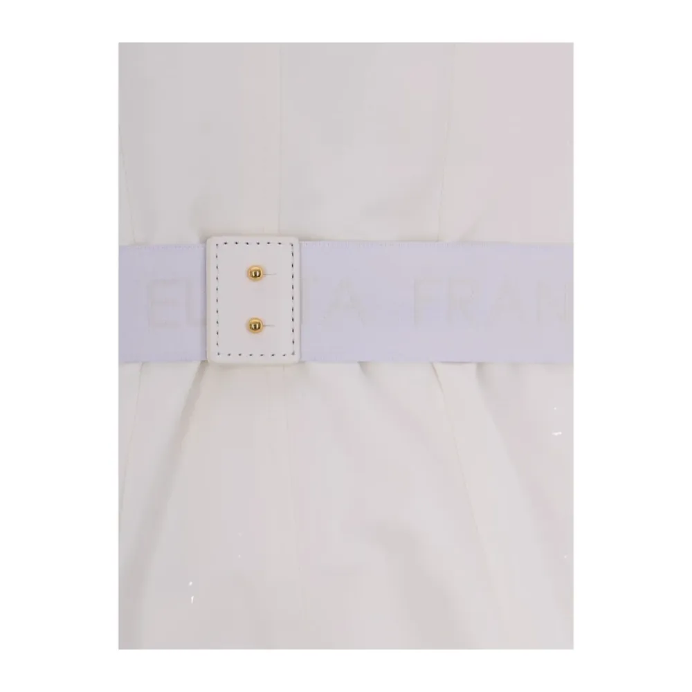 Elisabetta Franchi Teknisk Bi-Elastisk Stofjakke kombinerer en slank, skræddersyet silhuet med en bælte i taljen og en guldfarvet logo-plade. Den er designet til poleret styling fra dag til aften. Nøgleattributter: Hvid | Polyamid | Bi-elastisk (stræk) stof | Bælte i taljen | Satinfor | Matchende knapper | Polstrede skuldre | Klassiske revers | ¾ lange ærmer | Påsyede klaplommer | Stikninger | Guldfarvet logo-plade på bælte | Dimensioner og pasform: Længde 59 cm (IT størrelse 40) | Slank pasform | Sammensætning og pleje: 90% Polyamid | 10% Elastan