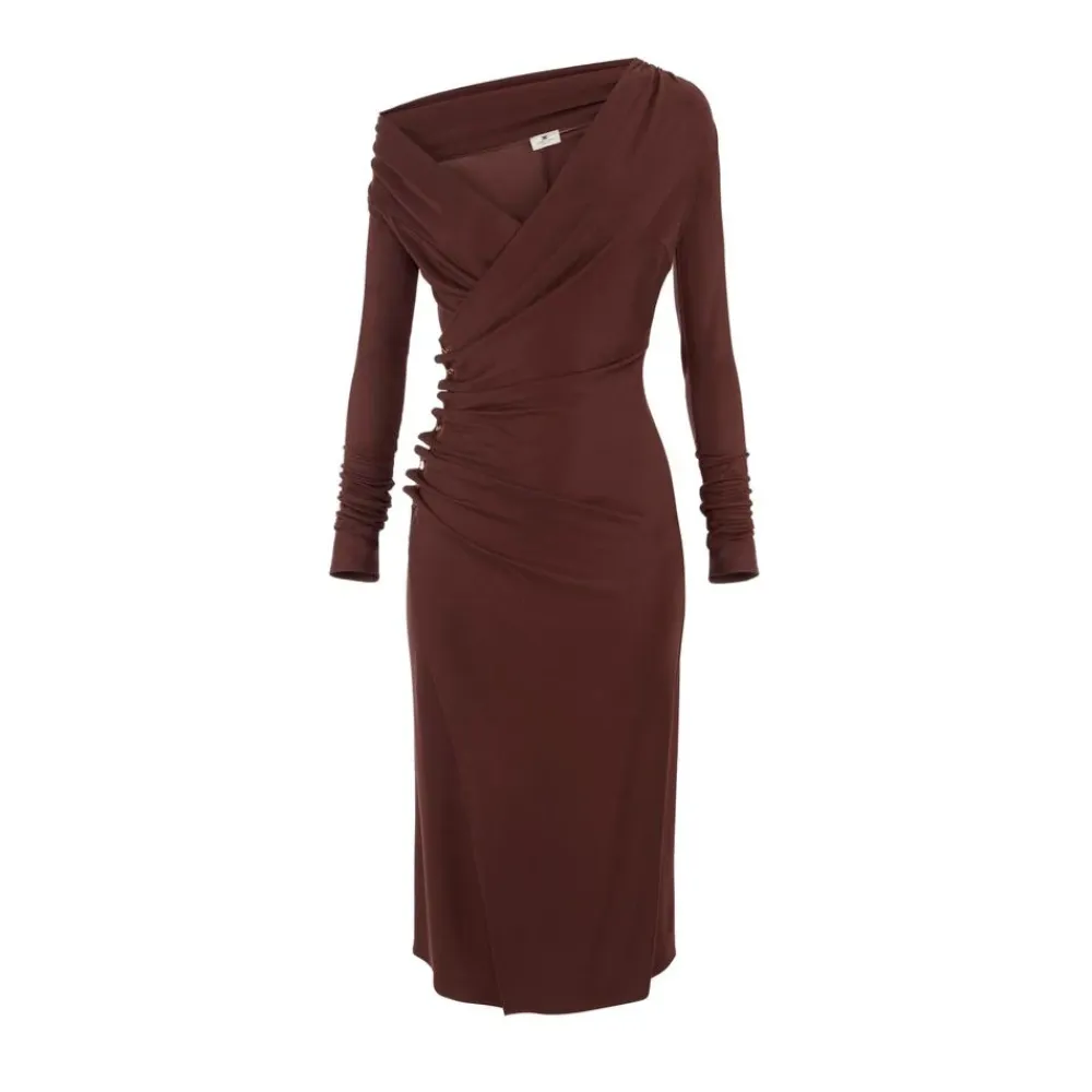 Elisabetta Franchi Jerseykjole med juvelknapper er en slim-fit midi-kjole, der fremhæver en asymmetrisk halsudskæring og en skulpturel sidedrapering, der er fastgjort med gyldne logoknapper. Ideel til elegante dags- og aftenlooks. Nøgleattributter: Brun | Kaffe | Viskose | Gyldne logo-metalknapper | Asymmetrisk halsudskæring | Lange ærmer | Elaboreret sidedrapering | Sideslidse | Midi-længde | Tredimensionel knapudsmykning | Dimensioner og pasform: Længde 140 cm (IT størrelse 40) | Slim fit | Modellen er 177 cm høj og bærer IT størrelse 40 | Sammensætning og pleje: 96% Viskose | 4% Elastan