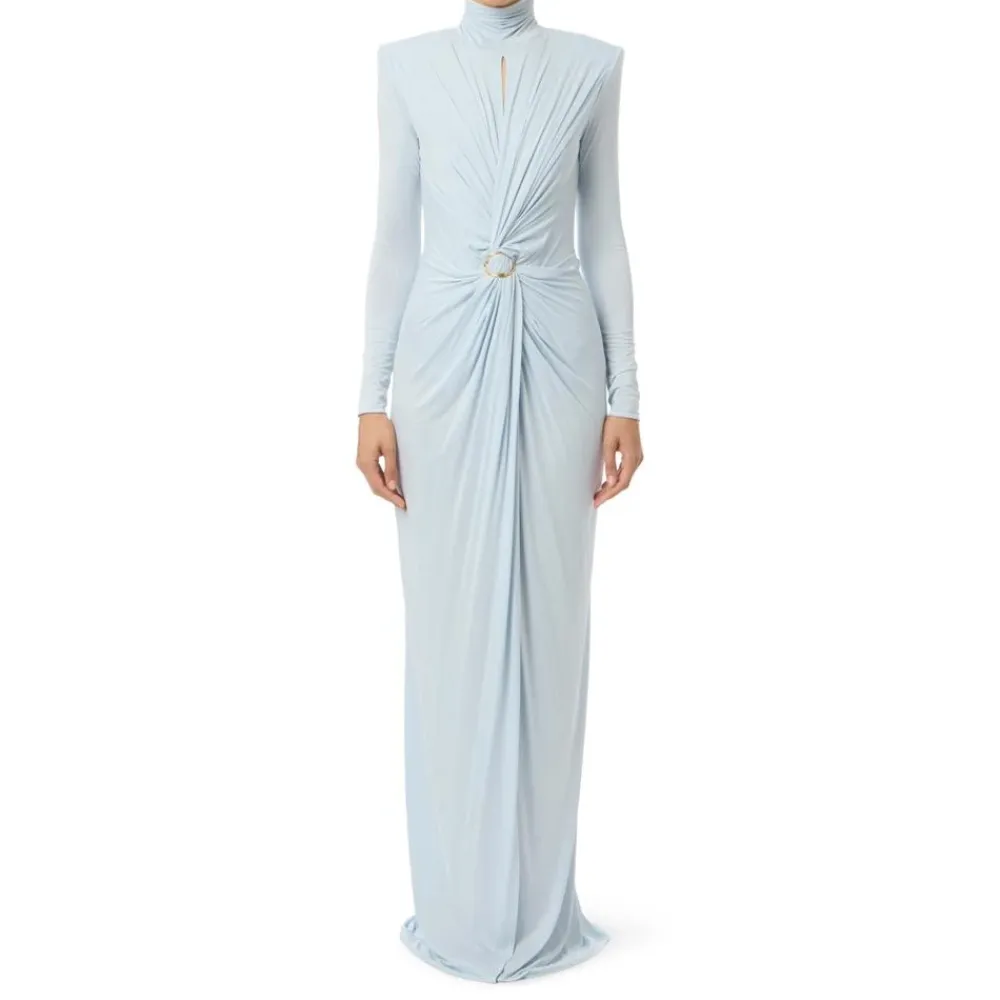 Elisabetta Franchi Red Carpet-kjole i Cupro Jersey med Draperinger tilbyder en skulpturel, slank silhuet og markante draperinger, der fastgøres med et gyldent logo-tilbehør – ideel til formelle aftener og arrangementer på den røde løber. Vigtige egenskaber: Blå | Stjerneskær | Cupro | Skjult lynlås | Hægtelukning i nakken | Høj krave | Lange ærmer | Indviklede draperinger foran, fastgjort med gyldent metallogo-tilbehør | Slids foran på skørtet | Nøglehul bagpå | Polstrede skuldre | Mål og pasform: Længde 165 cm for en IT-størrelse 40 | Slank pasform | Sammensætning og pleje: 92 % Cupro | 8 % Elastan
