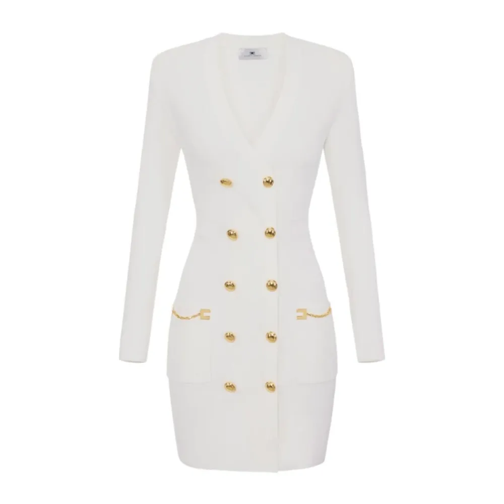 Elisabetta Franchi strikkjole med juvelknapper er en figursyet strikkjole i frakkestil, der skiller sig ud med sin V-udskæring og guldfarvede kæde- og knappedetaljer. Designet til elegante hverdagslooks, og kombinerer strukturerede skuldre med dekorative detaljer for en skræddersyet silhuet. Vigtige egenskaber: Hvid | Elfenben | Viskose | Let strik | Tæt halv-cardiganstrik | Påsatte lommer | Dobbeltknappet front | Knaplukning foran | V-udskæring | Polstrede/strukturerede skuldre | Kædedetalje med guldfarvet hardware | Juvelknapper | Mål og pasform: Længde 90 cm (IT størrelse 40) | Slim fit | Modellen er 177 cm høj og bruger IT størrelse 40 | Sammensætning og pleje: 68% Viskose | 27% Polyester | 5% Polyamid