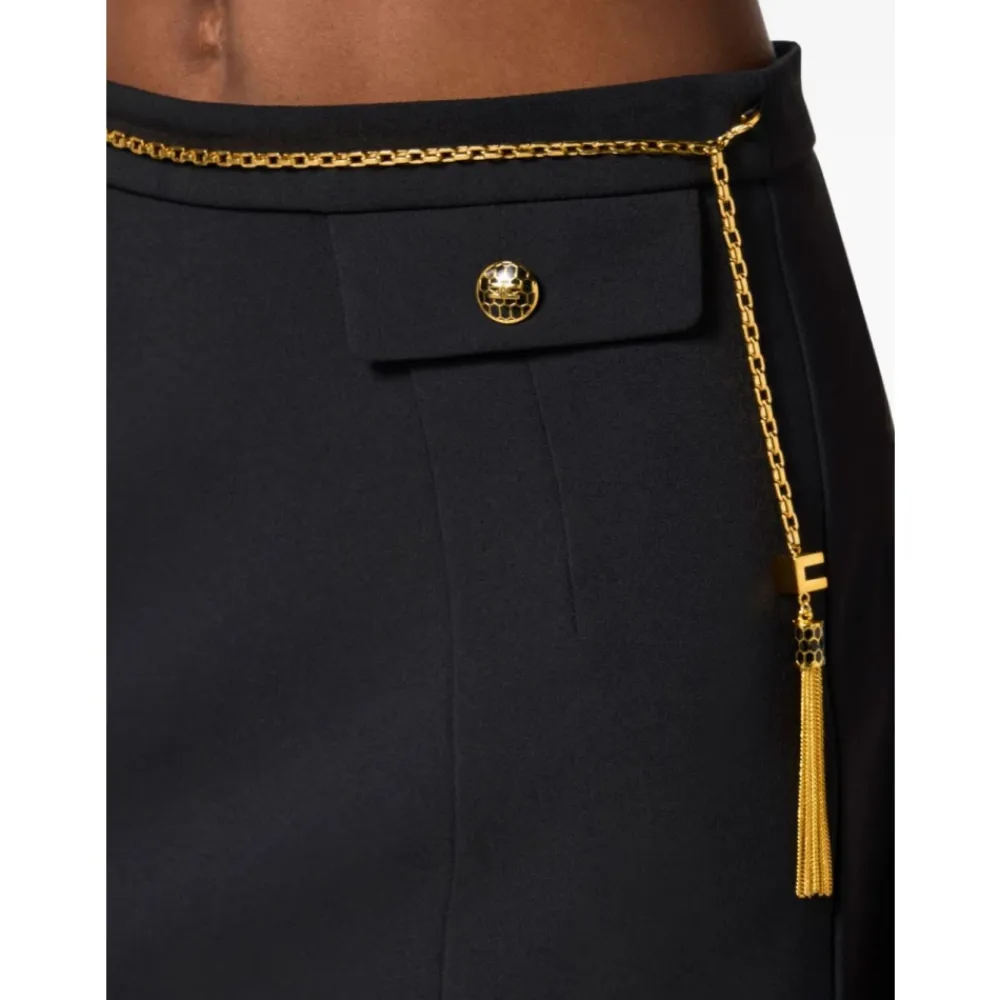 Elisabetta Franchi nederdel i dobbelt lag crepe stof med juvelkæde har en slank silhuet og et dekorativt kædebælte med kvast for et elegant look fra dag til nat. Nøgleattributter: Sort | Crepe (polyester-elastan) | Skjult lynlås | Kædebælte med kvast | Emaljerede logo knapper | Påsatte flapper | Juvel tilbehør i metal | Dobbelt lag crepe stof | Juvelkæde bælte med kvast | Slange-inspireret mønster på flapper | Påsatte flapper | Emaljerede logo knapper | Dimensioner & pasform: Længde 38 cm (IT størrelse 40) | Slank pasform | Sammensætning & pleje: 96% Polyester | 4% Elastan