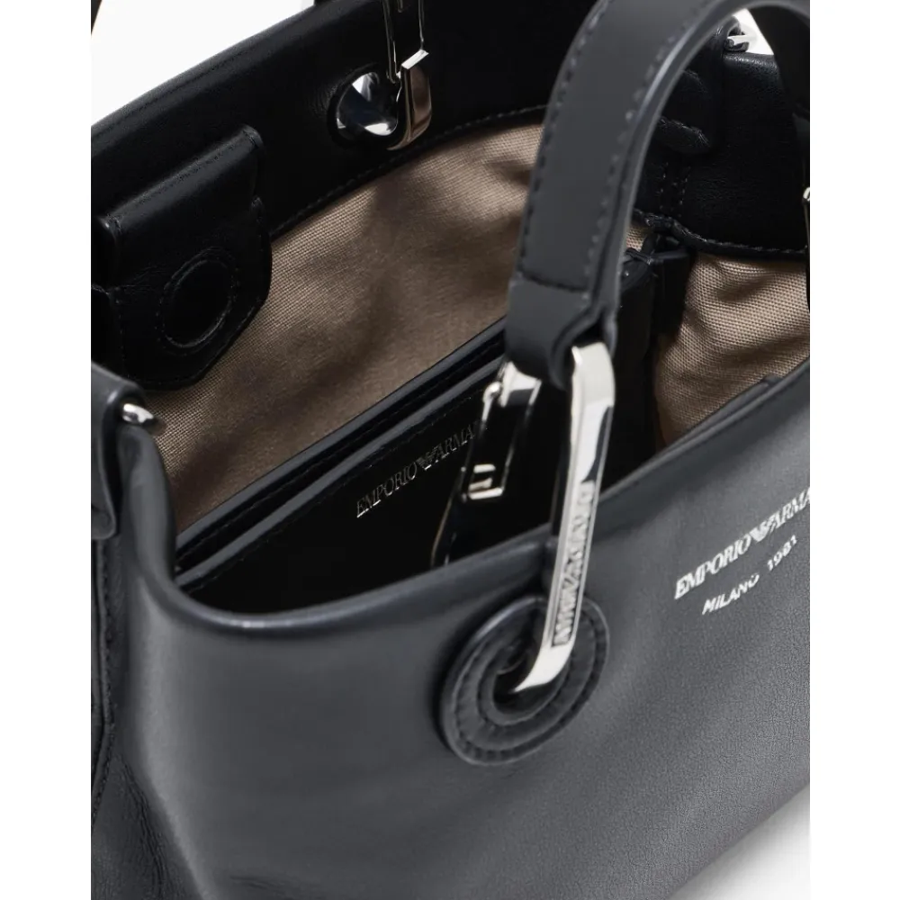 Emporio Armani My EA XS Handbag er en kompakt lædertaske designet til hverdagsbrug. Den kombinerer en struktureret silhuet med en aftagelig skulderrem for alsidig brug i hånden eller som crossbody. Vigtigste egenskaber: Sort | Fintnarvet koskindslæder | Magnetlukning | Dobbelte tophåndtag | Aftagelig og justerbar skulderrem | Indvendig rumdeler | Indvendig slip lomme | Polerede metalbeslag | Serigrafi-logo | Struktureret silhuet | Poleret sølvfarvet hardware | Mål og pasform: 21 x 16 x 7 cm (bredde x højde x dybde) | Sammensætning og pleje: Læder | Polyester (foer) | Metal hardware | Aftørres med en blød klud; undgå vand og direkte varme. Opbevares i en støvpose og overvej professionel læderrensning for pletter eller dyb rengøring.