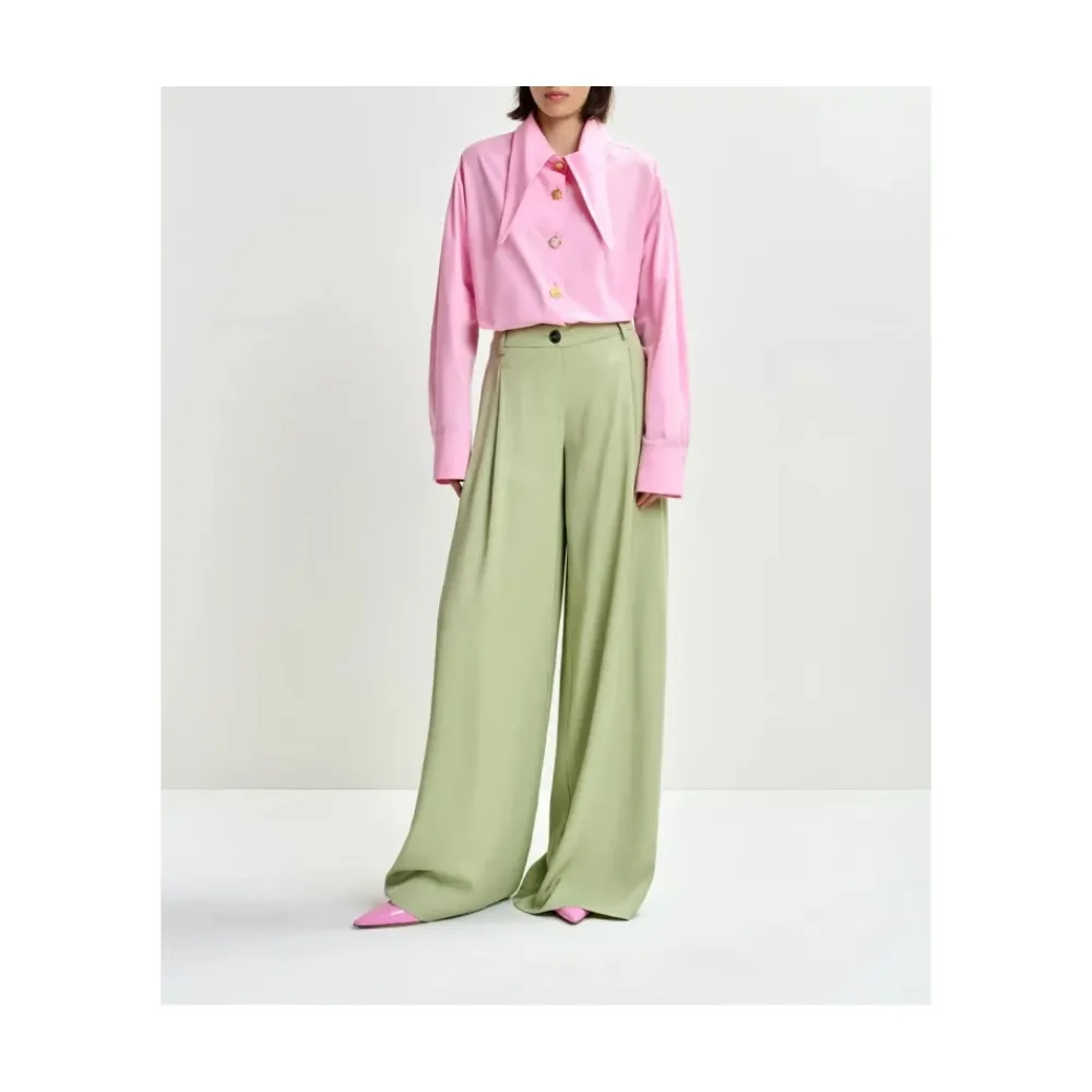 Essentiel Antwerp JUSTICIA Trousers er højtaljede bukser med brede ben, der tilbyder en afslappet, skræddersyet silhuet. De skiller sig ud med deres pressede plissering og rene finish, der er velegnet til både arbejde og et mere elegant, afslappet look. Nøgleattributter: Lysegrøn | Lyocell | Mellemvægtigt, ikke-strækbart stof | Lynlås- og knaplukning | Skrå forlommer | Paspoleret baglomme | Bæltestropper | Pressede plisseringer i taljen | Skræddersyet finish | Dimensioner og pasform: Størrelse 36 — Indvendig benlængde: 85,5 cm | Størrelse 36 — Talje: 75 cm | Afslappet pasform | Høj talje | Brede ben | Sammensætning og pleje: 100% Lyocell | Maskinvask ved 30°C. Må ikke tørretumbles. Stryg ved lav temperatur.