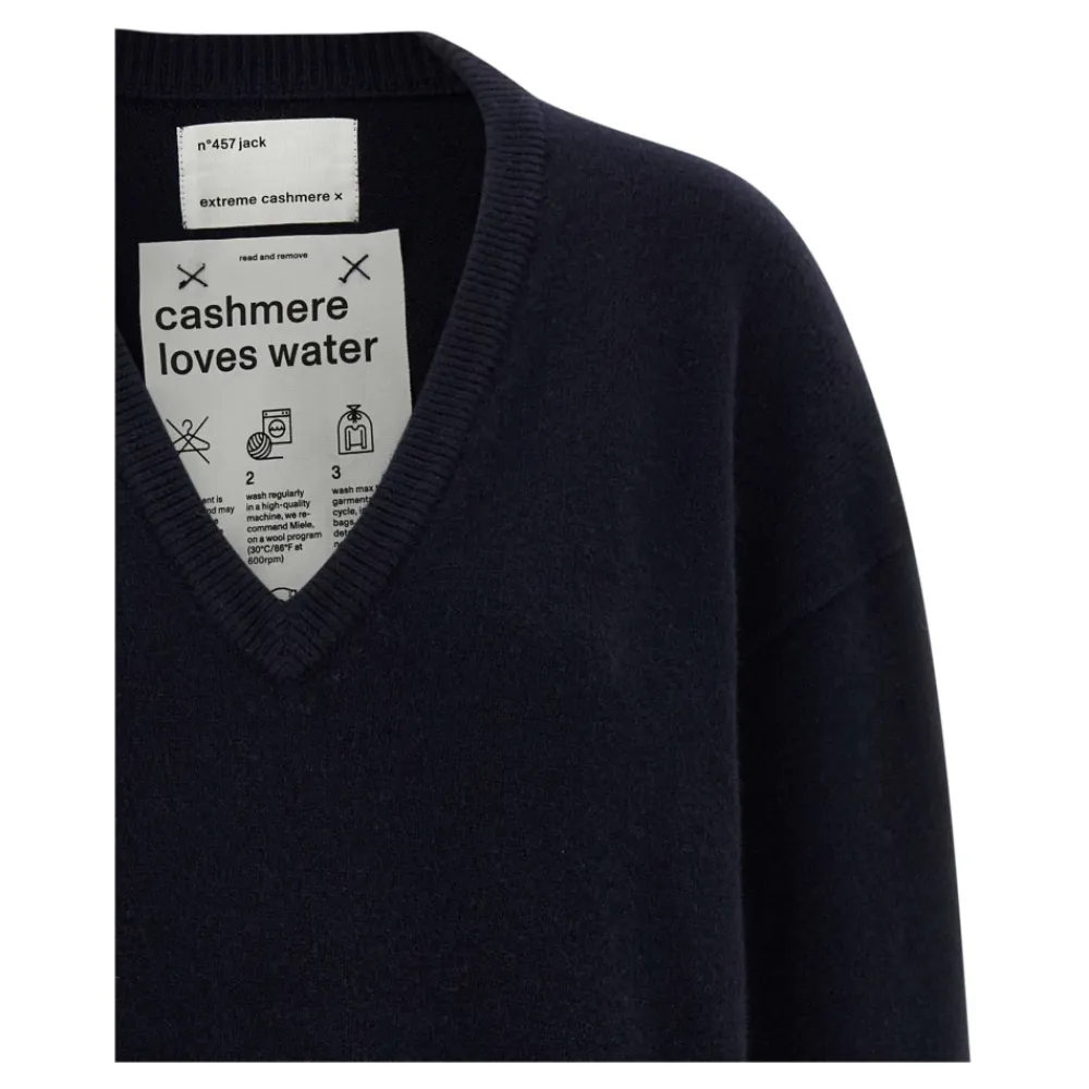 Extreme Cashmere’s N°457 Jack Sweater er en V-hals cashmere-blanding strik, der kombinerer raffineret blødhed med afslappet, one-size styling. Brug den lagdelt eller alene for et poleret og let look. Vigtigste egenskaber: Blå | Cashmere | V-hals | Lange manchetærmer | Ribstrik | Lige kant | Dimensioner & pasform: One size | Sammensætning & pleje: 94% cashmere, 5% nylon, 1% elastan | Kun kemisk rensning