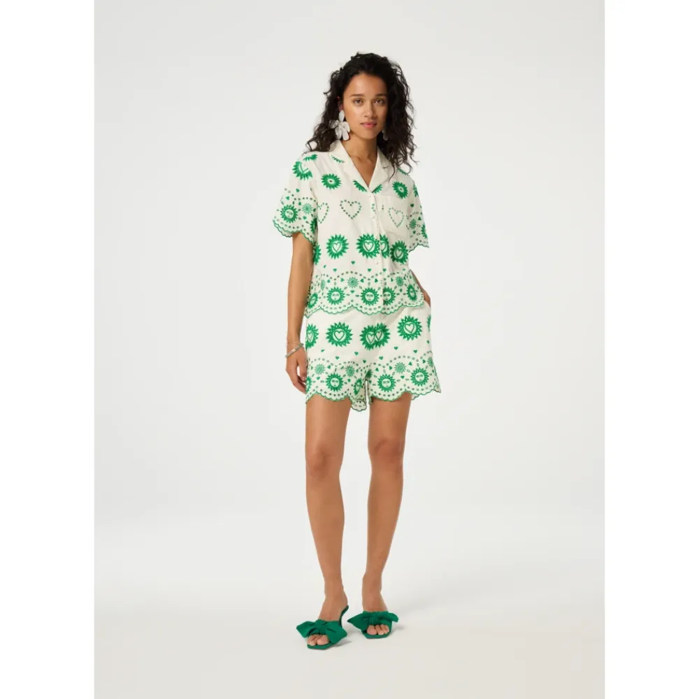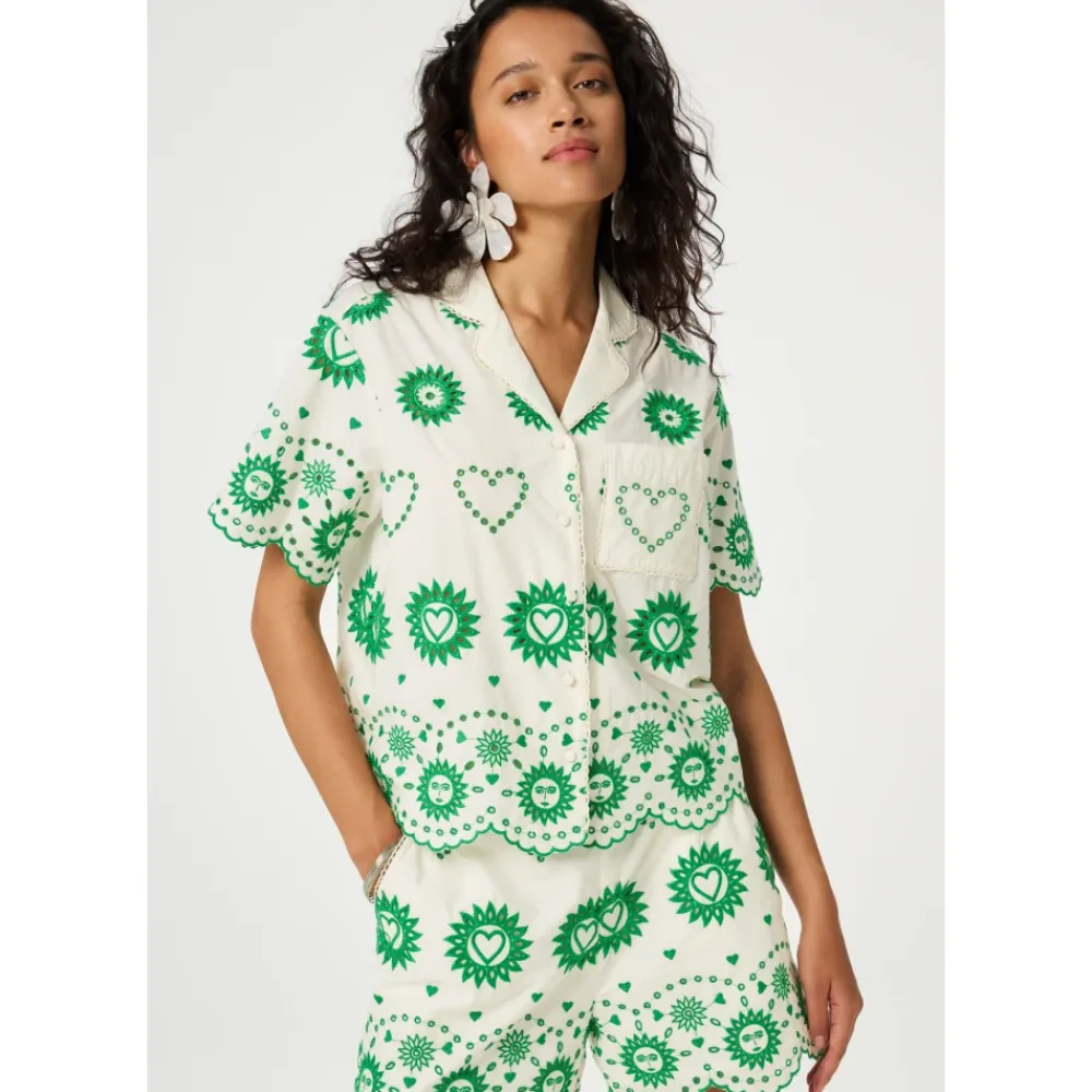 Brielle Blusen fra FABIENNE CHAPOT er en let og luftig bluse med detaljerede grønne broderier og en charmerende, bølget kant, perfekt til de varme dage. Kombinér den ubesværet med Cari Nederdelen for et elegant sommerlook. Produkt detaljer: Cream White | Multicolor | detaljerede grønne broderier | charmerende, bølget kant | Dimensioner og pasform: passer normal i størrelsen | oversized fit |