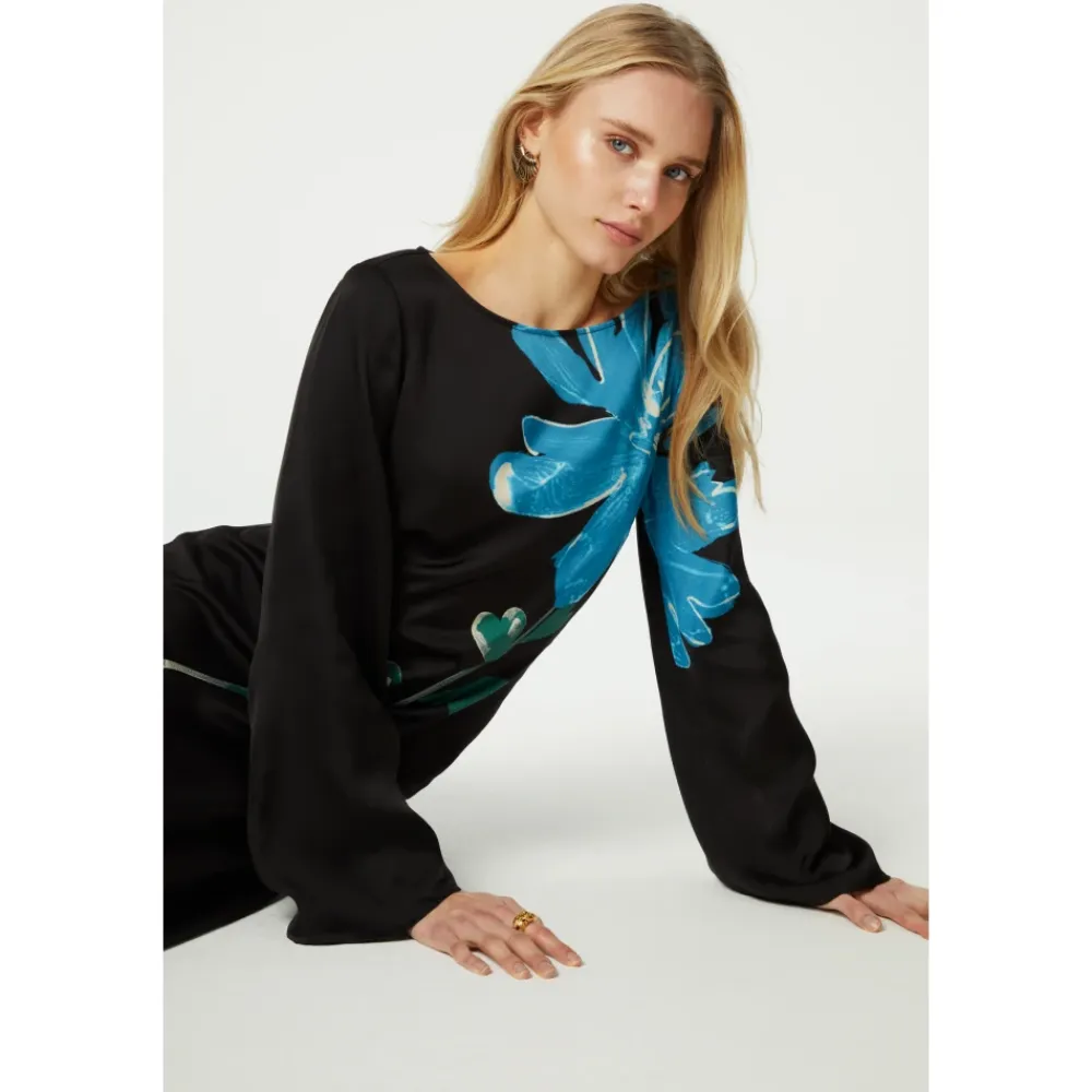 Den Blomstrede Midi Kjole fra Fabienne Chapot er en sofistikeret tilføjelse til enhver garderobe, med et slående sort og blåt blomstermønster. Dens elegante design med lange, udvidede ærmer og en rund halsudskæring gør den perfekt til både hverdags- og aftenbrug. Produkt detaljer: Sort | Blå | Viskose | Rund halsudskæring | Lange, udvidede ærmer | Dimensioner og pasform: Midi-længde | Sammensætning og pleje: 50% viskose (lenzing™ ecovero™) | 50% viskose