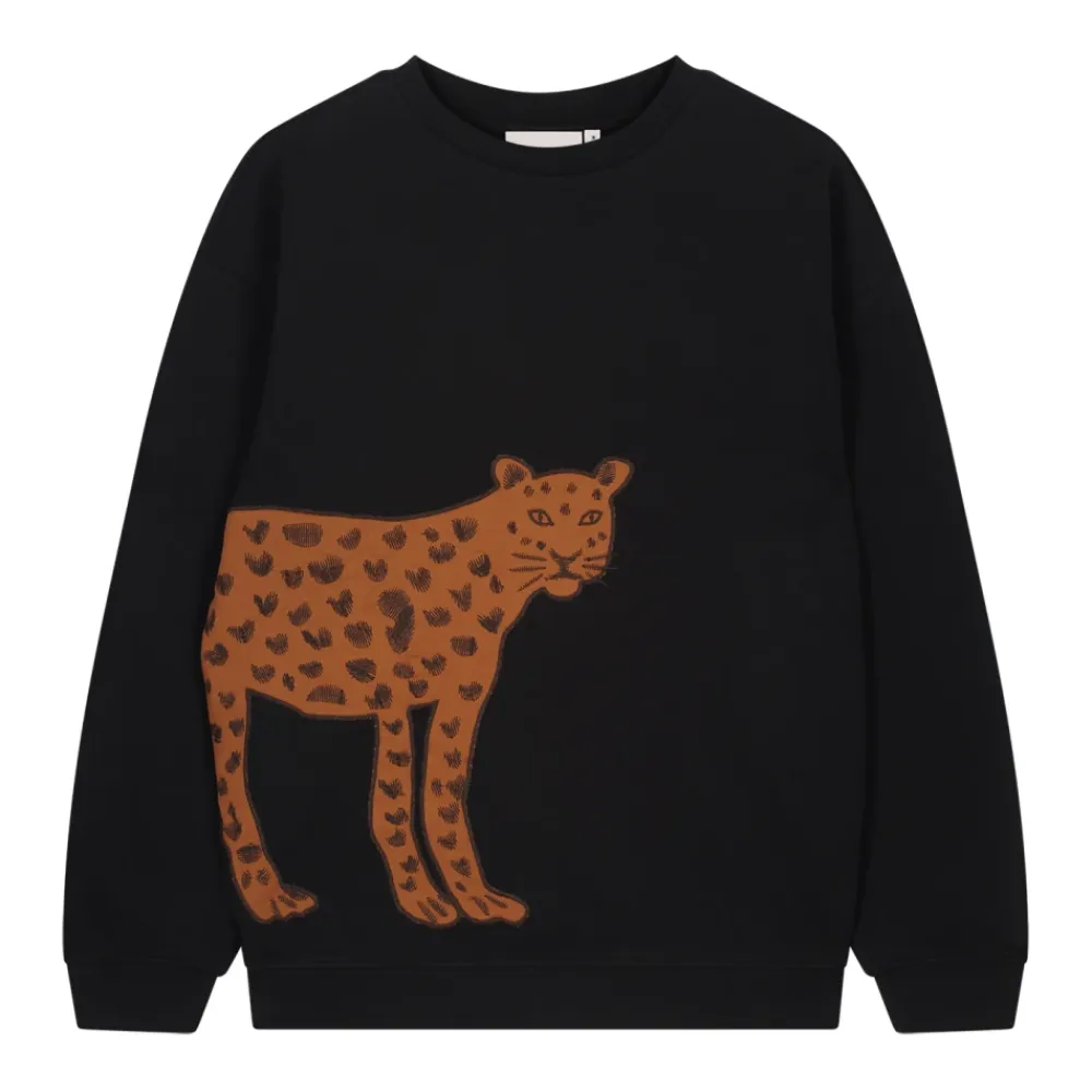 This black sweater is made from 100% cotton and features a bold leopard print on the front. Pair it with black pants for a stylish, coordinated outfit.