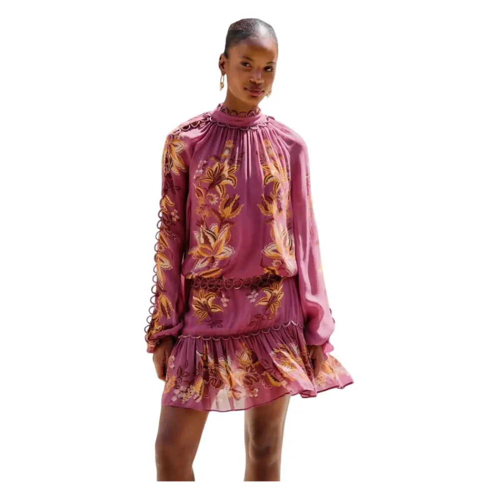 FARM Rios Delicate Chintz Mini Dress giver et chintz-inspireret look til en kort silhuet, der er ideel til varme udflugter og afslappede arrangementer. Vigtigste egenskaber: Pink | Chintz finish | Mini længde | Dagkjole styling